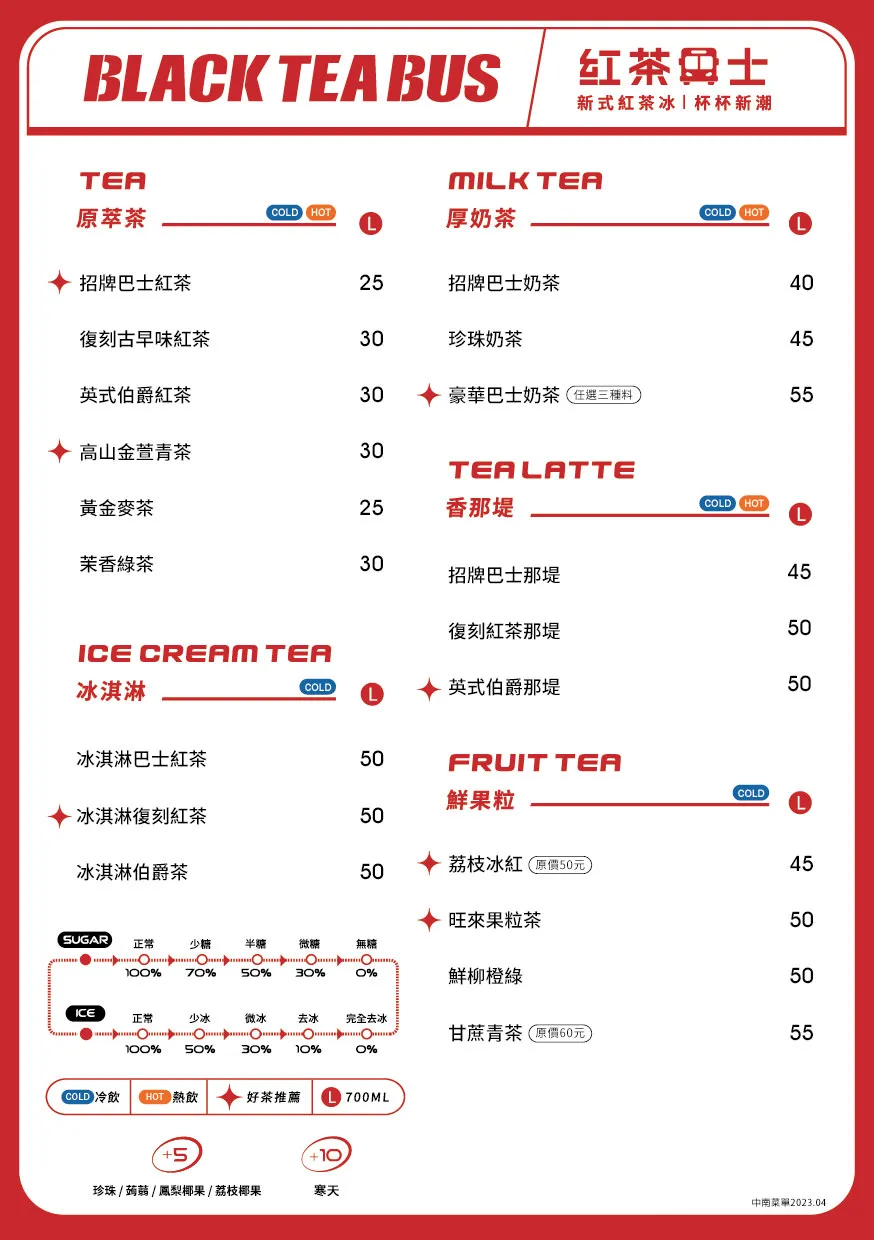 以白色為基底,配上紅色外框和紅色字體的菜單,紅茶巴士以獨特的視覺風格呈現出眾多茶飲選項。菜單上的茶系列以黑色字體顯示,與紅色的分類字樣形成鮮明對比,更凸顯出每款茶飲的特色。而人氣款茶飲更特別以閃亮的標誌作為符號,讓它們在菜單上一目瞭然,吸引著顧客的目光。