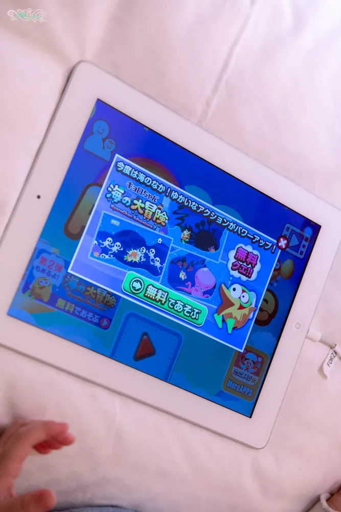 所有房型都附有免費的手機跟iPad供旅客使用。iPad內裡面預設就裝有很多有用的App及遊戲,小凌雲一進房間後,iPad就被他霸佔了,每個無料的遊戲都讓他玩的開心不己。