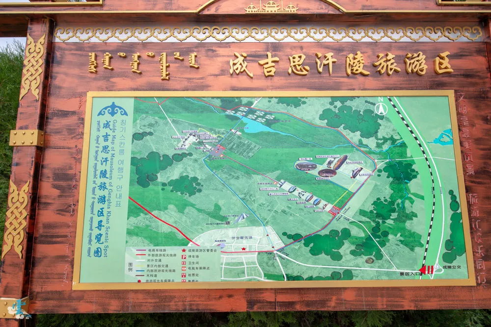 在遊客中心旁邊,有成吉思汗陵旅遊區的導覽地圖,遊客可以在此看一看整個陵墓的地理相對位置關係。