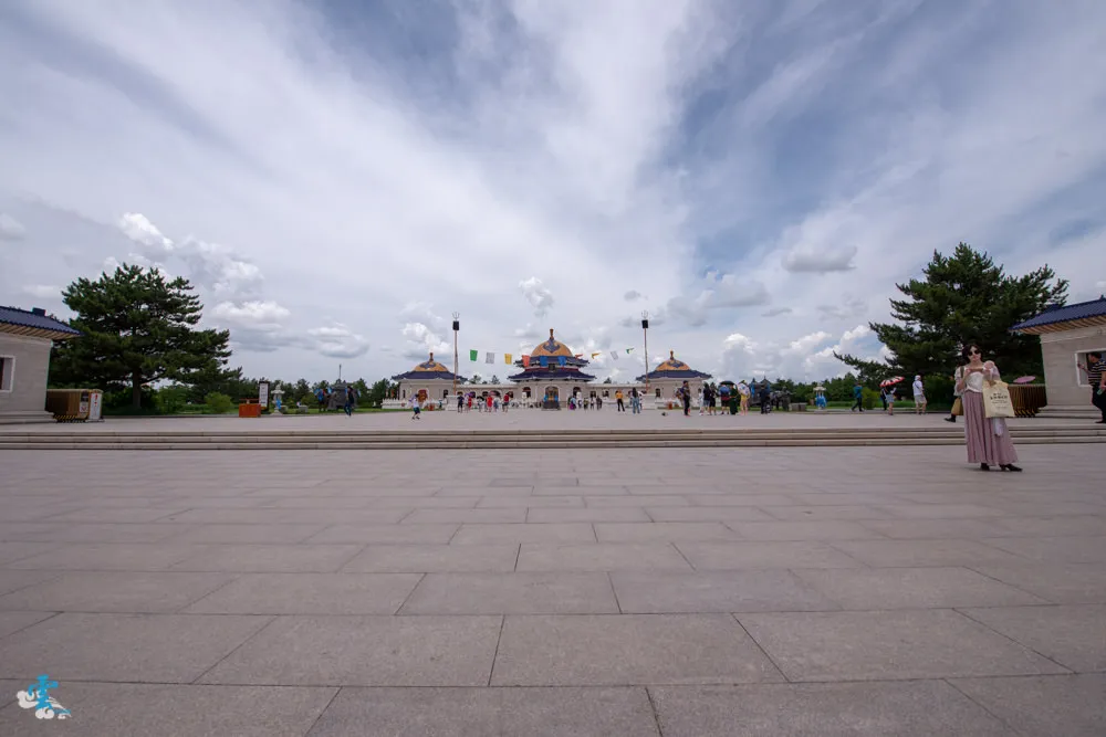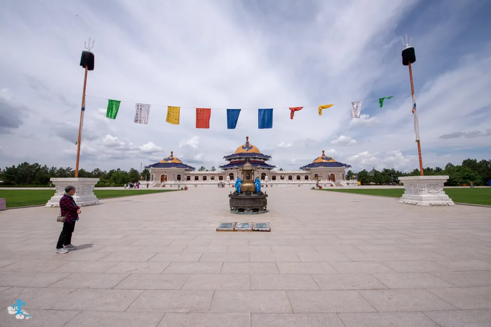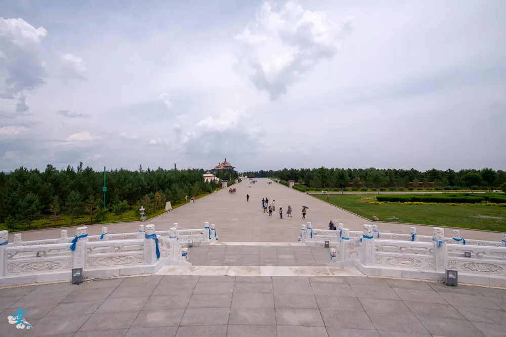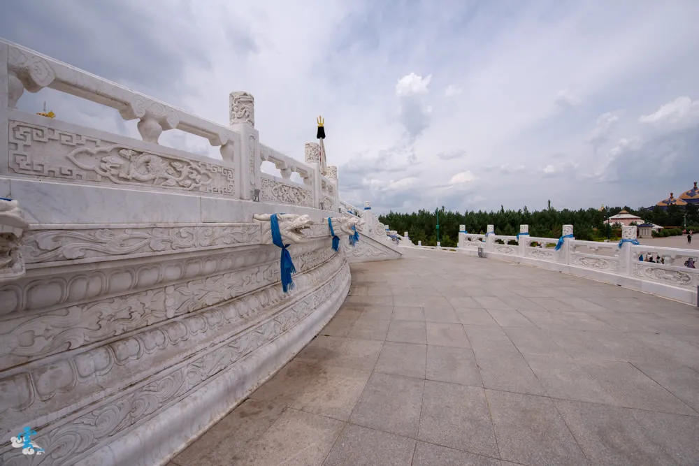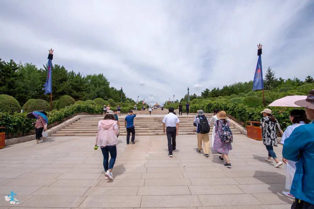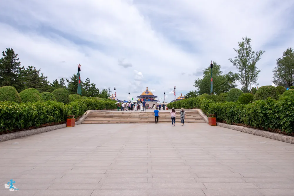 過了銅像廣場繼續拾階而上,這長長的一條類似參道的道路,蒙古人稱之九十九吉祥台階,每九個階梯就緊接著一個長長的台面,很特別的是~往上看,見階不見台;往下看,見台不見階。九是個位數中的最大值,隱含至尊之意,自古以來一直被蒙古族視為最吉祥的數字,所以蒙古文化中,很常發現九這個數字被應用在其中。