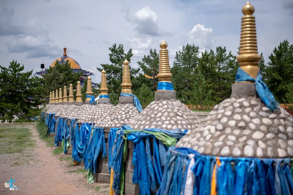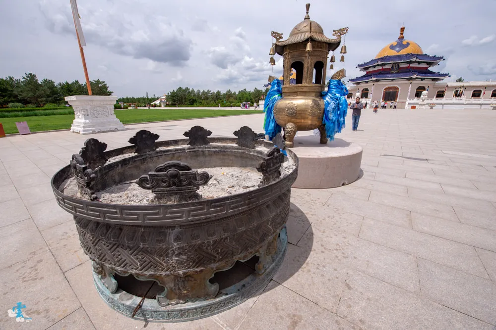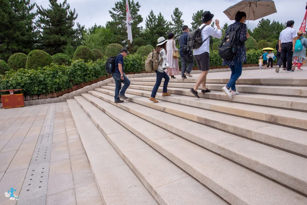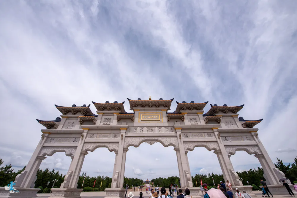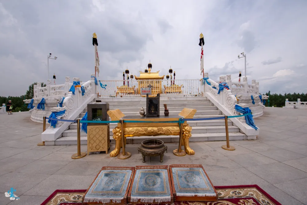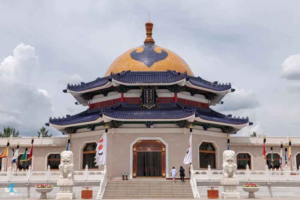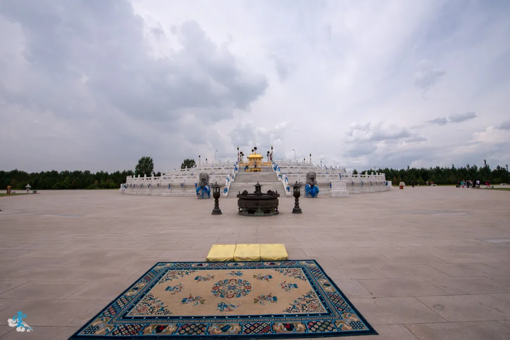 過了銅像廣場繼續拾階而上,這長長的一條類似參道的道路,蒙古人稱之九十九吉祥台階,每九個階梯就緊接著一個長長的台面,很特別的是~往上看,見階不見台;往下看,見台不見階。九是個位數中的最大值,隱含至尊之意,自古以來一直被蒙古族視為最吉祥的數字,所以蒙古文化中,很常發現九這個數字被應用在其中。