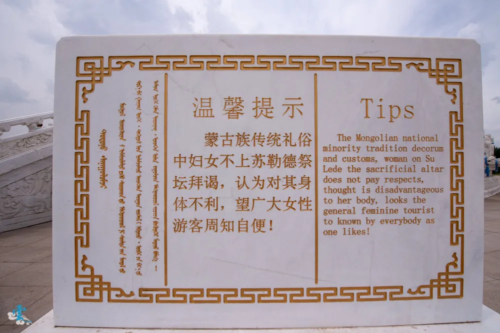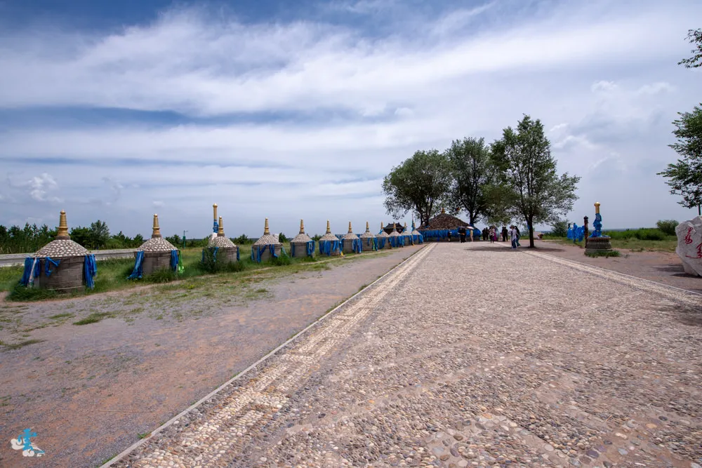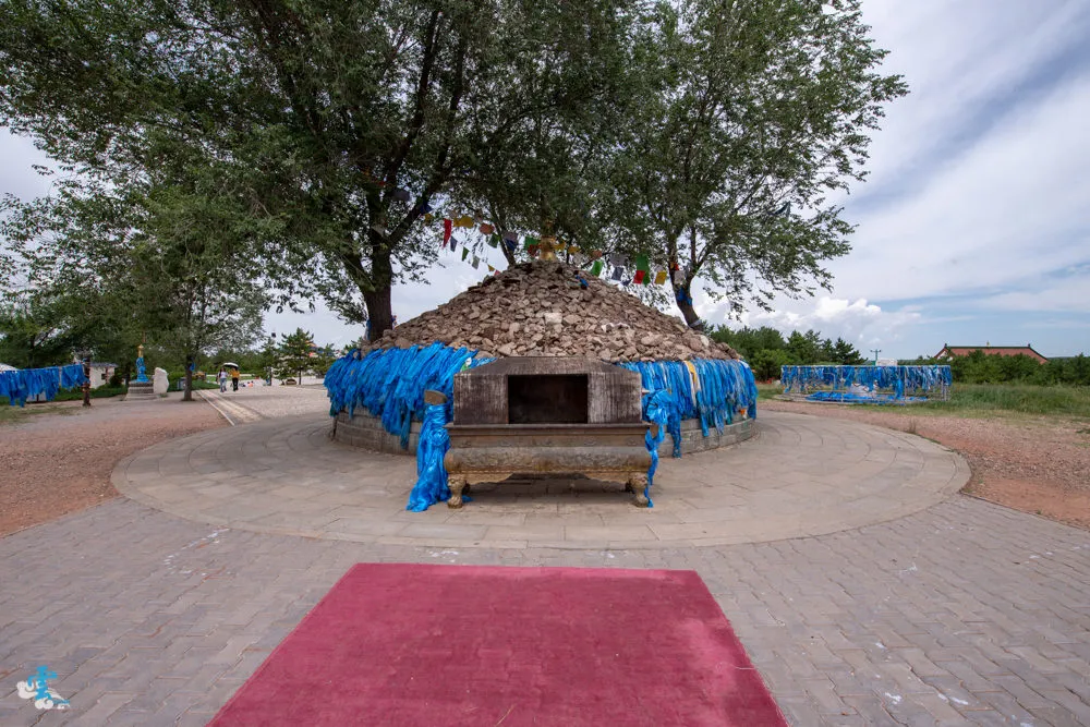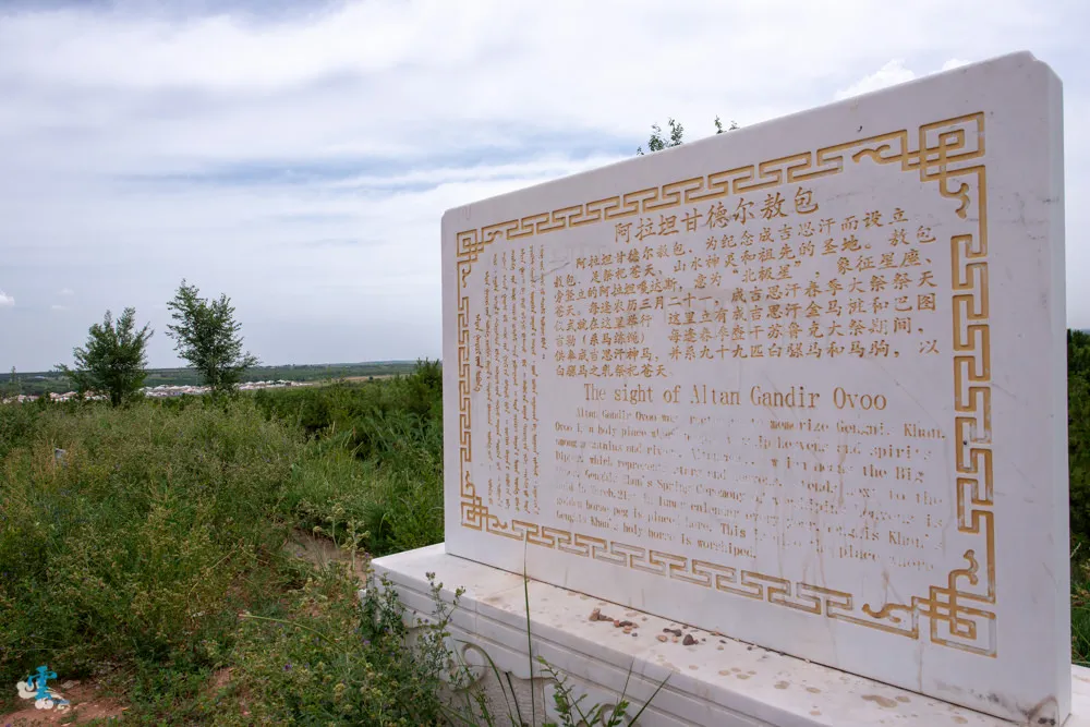 走過九十九吉祥台階,先別急著往陵墓前進,右手邊有一個阿拉坦甘德尔敖包,聽導覽員說成吉思汗晚年四處征戰路過此處,見這裡水草風景豐美,看的出神之際,失手將金色馬鞭掉在地上,蒙古人為了紀念成吉思汗在此掉了馬鞭而建立的敖包。敖包文化是蒙古族古老文化的精髓之一,最初是作為地域、道路的標誌,因為在廣大的草原上沒有個地標指示,容易迷失了方向,早期蒙古人只要經過敖包,都會下馬向敖包參拜,祈求平安,後來慢慢的敖包演變為天和神的象徵。現在是蒙古族向長生天祈求國泰民安,寄託希望的心靈聖地。而阿拉坦甘德尔敖包是每年成吉思汗春季大祭祭天的儀式所在地。成吉思汗在此掉了馬鞭,蒙古人就為他建了一個大敖包,凌雲在此掉了一瓶水,所以~~~同行友人就再給凌雲一瓶水~哈。