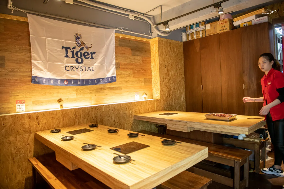 熱炒火鍋殿屬於長方形的用餐空間,各有2、4與6人座的座位配置。整個用餐空間以木質為基底,配上暖色系的燈光,在寒冬中更添暖意。最後面還有一個半開放式的包廂空間,很適合家庭聚會、部門聚餐、春酒或同學會之類的聚餐。