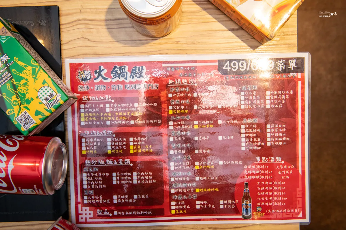 轉變成以熱炒為主,鍋物變成是附加的,之前因為是火鍋吃到飽,所以湯頭種類比較豐富,現在則改成保留一些特色鍋物,像是澳門卜卜鍋、重慶麻辣烤魚等等,羊肉爐與薑母鴨則是季節限定款,目前看到的是初定版本的熱炒菜單,之後都還會再做更改,老闆希望的菜色目標是100道,目前還有諸多菜色正在討論中,實際菜單請以熱炒火鍋殿臉書粉絲頁資訊為主。