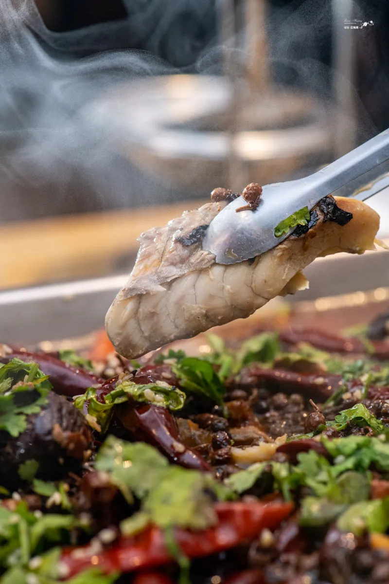 麻辣烤魚是源自重慶的正宗渝菜,選用一整隻的七星鱸魚,再加入鮮蝦、香菇、金針菇、花枝、肉桂與白豆蔻等配料,再灑上大量的各式大辣椒、花椒、洋蔥、蒜頭、丁香與小茴香等多種新鮮香料熬煮而成的湯底。一送上桌輕煙飄散,各式辣椒與花椒的麻辣香氣在空中飄散,吃一口馬上麻整嘴,潑辣的紅油恣情奔放,給你帶勁又有層次的味蕾之旅,七星鱸魚細嫩的肉質加上沒有土味,在香麻帶勁的豐厚味道中,依然能品嚐到他厚實的鮮味,嗜辣的朋友一定超愛的。