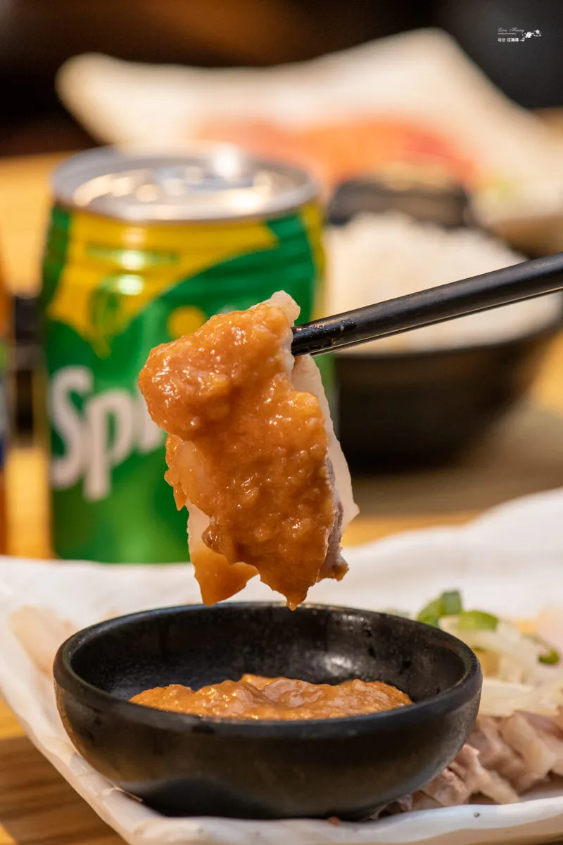 今天上桌的是鮭魚跟旗魚,每天不一定是相同的魚類,含有豐富油脂量的生魚片,厚度跟份量都相當有誠意。