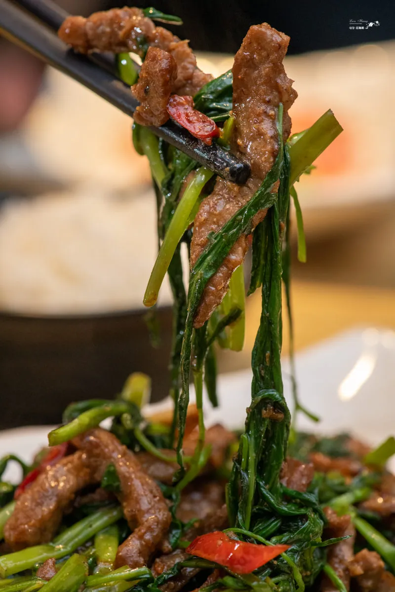 這是道女王在家也常做的菜色,清脆的空心菜讓嫩滑入味的牛肉更加帶勁,特調的沙茶醬汁帶來扎實的滋味,很下飯的好酒菜。
