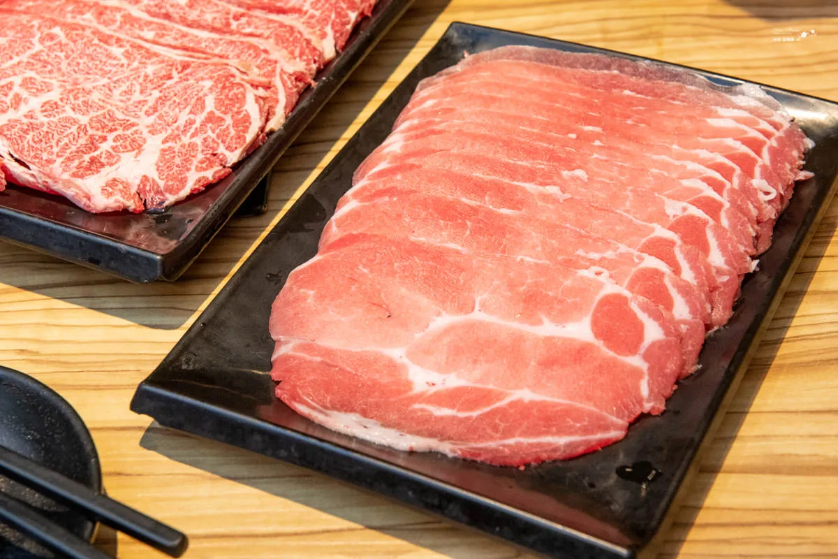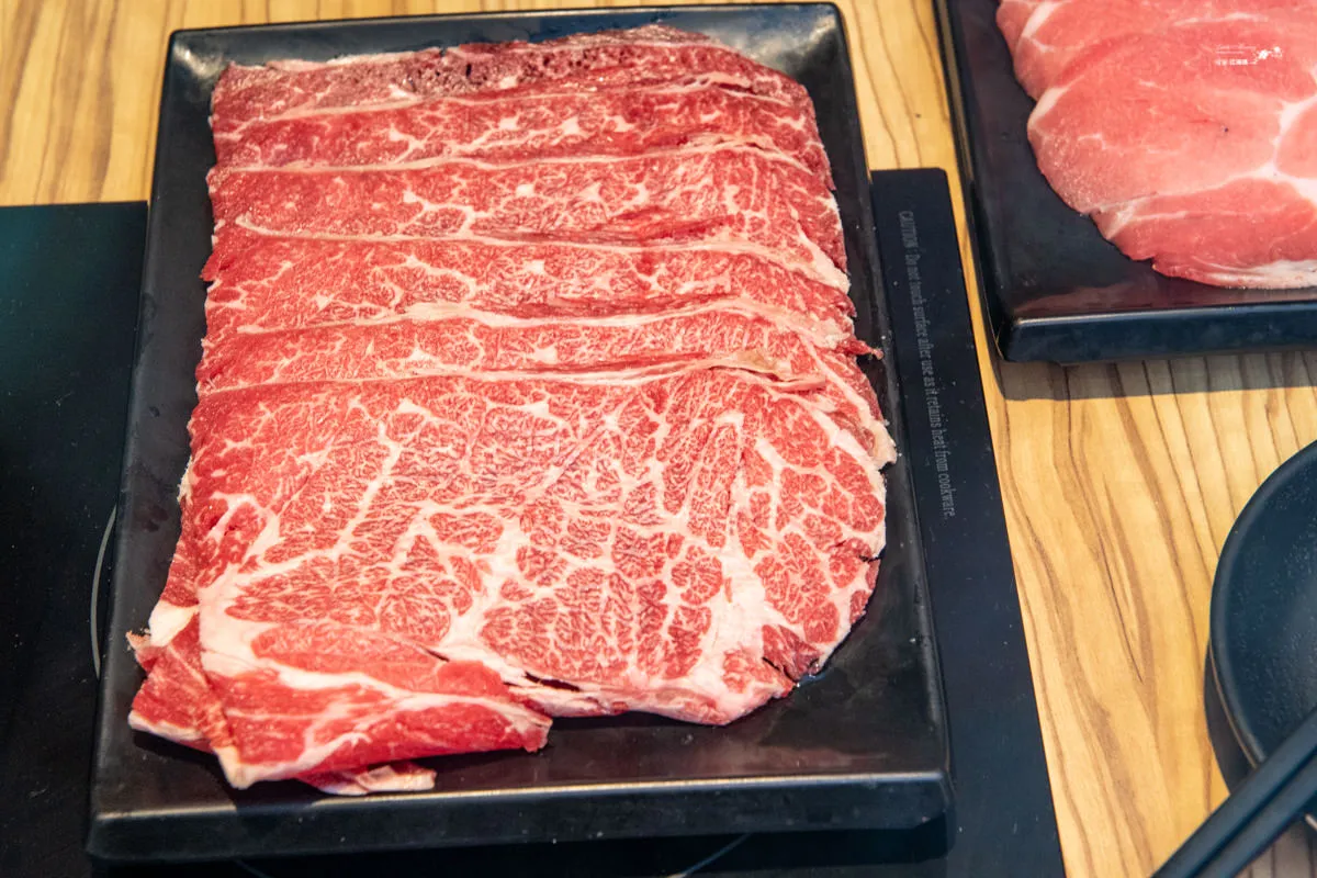 鍋物吃到飽,肉片加點是一定要的啊,先各點一份牛跟豬,油花的分佈都非常均勻細緻,在重慶麻辣鍋內汆燙過後,油花油脂與麻辣在唇齒之間交舞出幸福的愉悅感,所以又續了一盤。