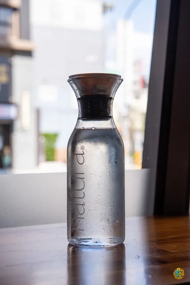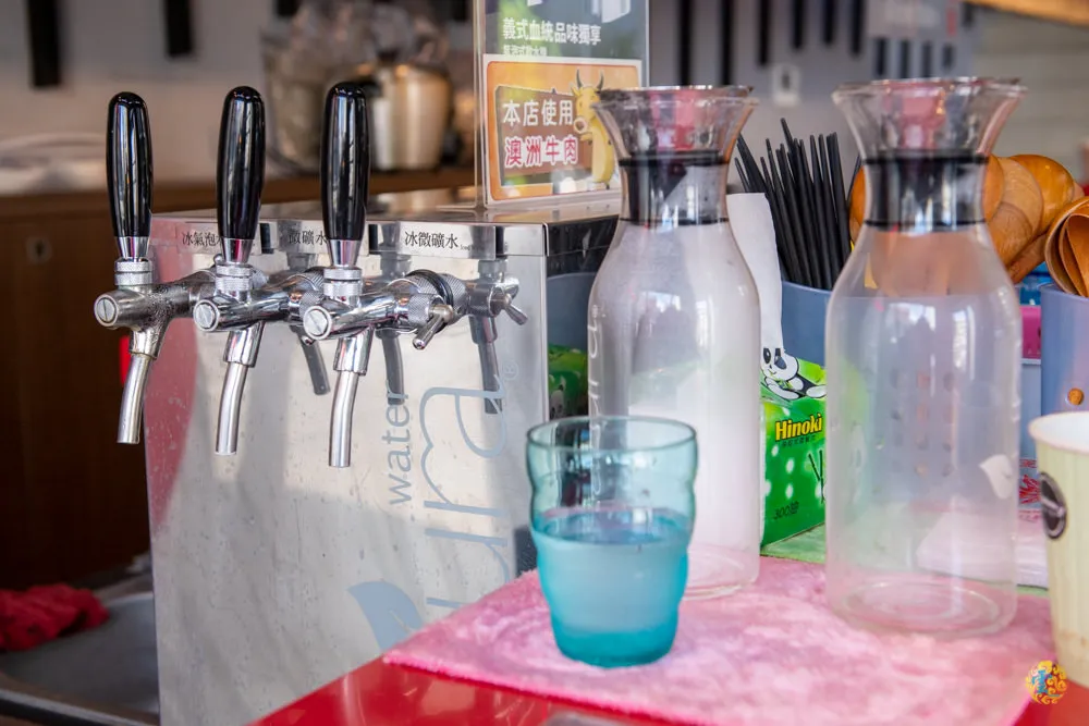 厚醍牛肉麵沒有販售任何飲品,取而代之的提供免費的Natura微礦氣泡水,聽老闆說是由美國太空總署開發的商用氣泡水機,讓水經過三道濾心在加紫外線殺菌,就成了微礦水,然後在加壓打入食用級二氧化碳氣體,就成了好喝的Nature微礦氣泡水。氣泡水機使用的氣泡瓶因為是食用等級,每瓶都需要經過檢驗,檢驗合格的鋼製瓶身都附上帶有QR Code的檢驗證明。老闆會在自助區這邊先準備好裝滿氣泡水的水瓶,讓顧客可以直接取用,如果同行的朋友比較多的話,老闆表示可以直接帶著一瓶放在桌上。