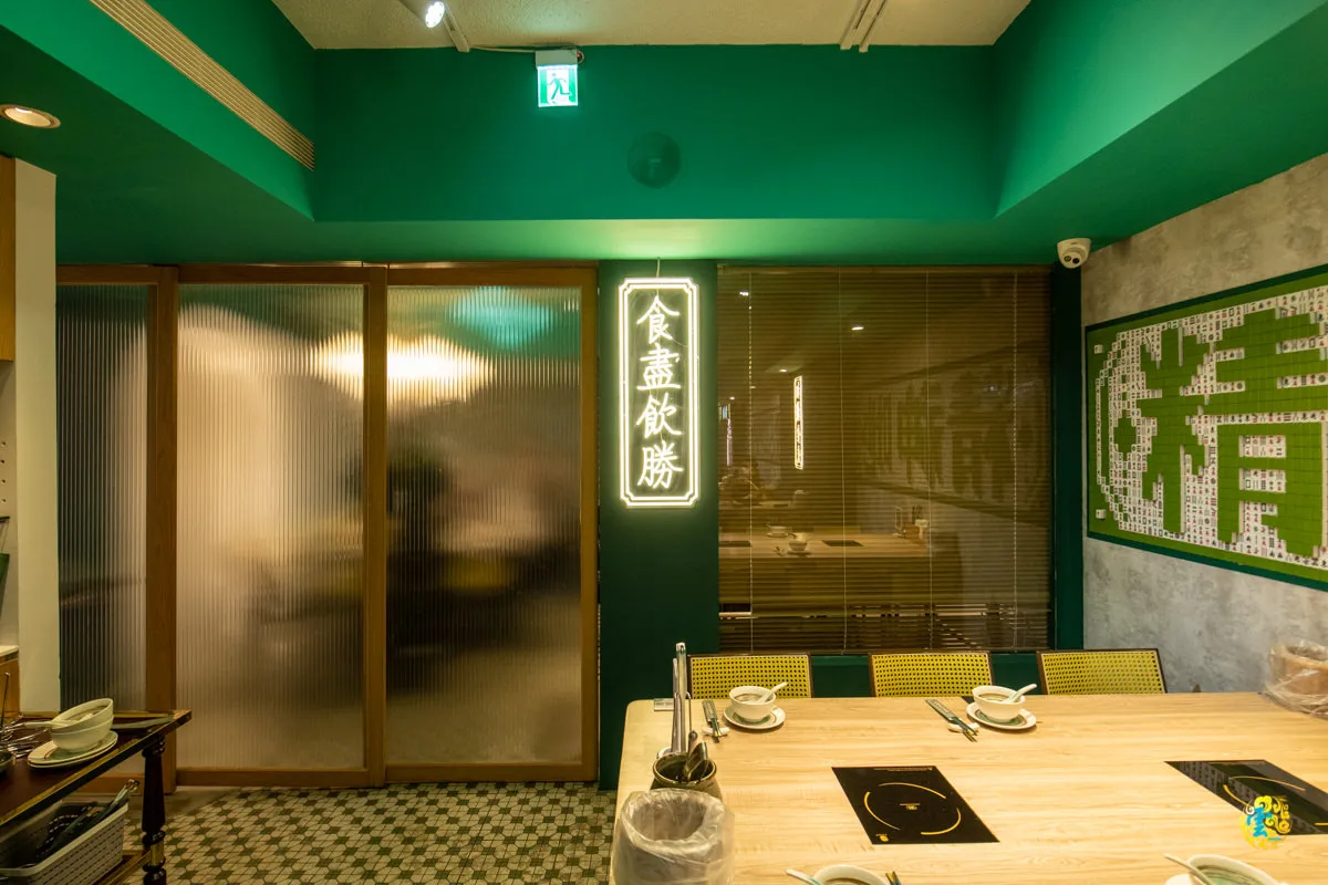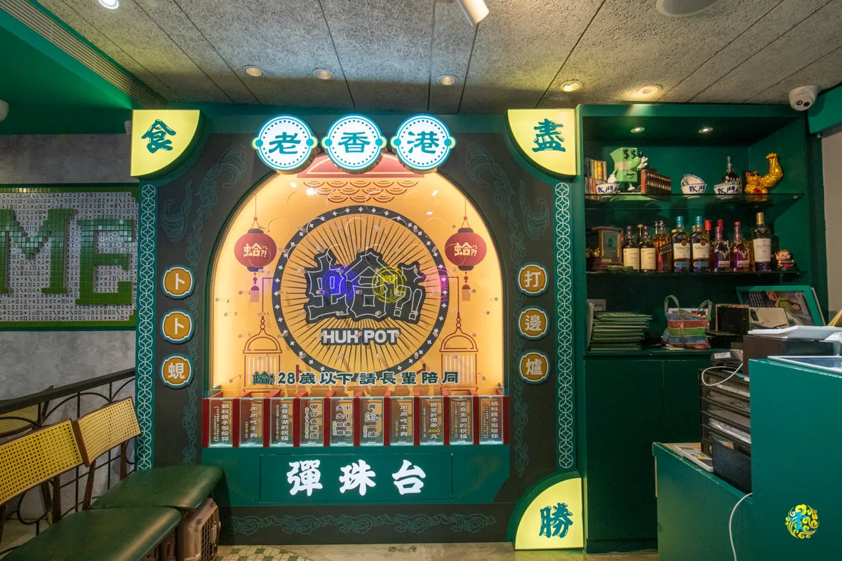 長方形的店內環境,L型的用餐空間,開放式的廚房設計以及隱密的包廂。以復古香港元素的軍綠色為主軸色彩,搭配綠白的復古港式花磚,懷舊況味濃郁, 牆面上透過極具港式特色的霓虹燈與麻將元素,吸引視覺注目的焦點,也賦予了蛤 Huh Pot 台北忠孝店港式魅力和個性,大面積的落地窗設計,帶來明亮的採光也延伸視覺感受,整體氛圍不只復古懷舊也簡潔明亮,店內播放的都是粵語老歌居多,更添那份港式懷舊的氛圍。