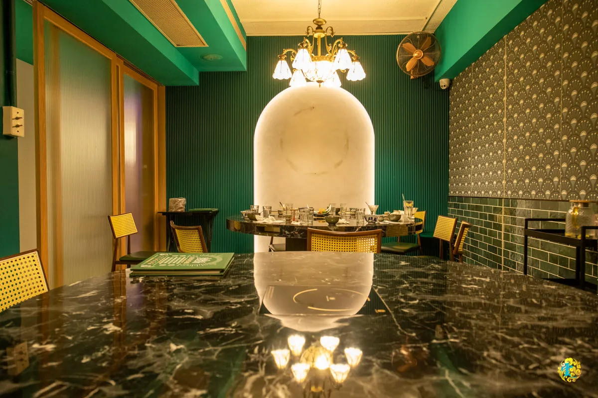 包廂的低消是一萬元,共有兩張桌子,約可容納10-15位賓客,位置在餐廳的最後方,隱密又安靜,帶你進入老時光的復古絢麗裝潢,在這種特殊的氛圍中,讓原本就美味的餐點顯得更有味道了說。