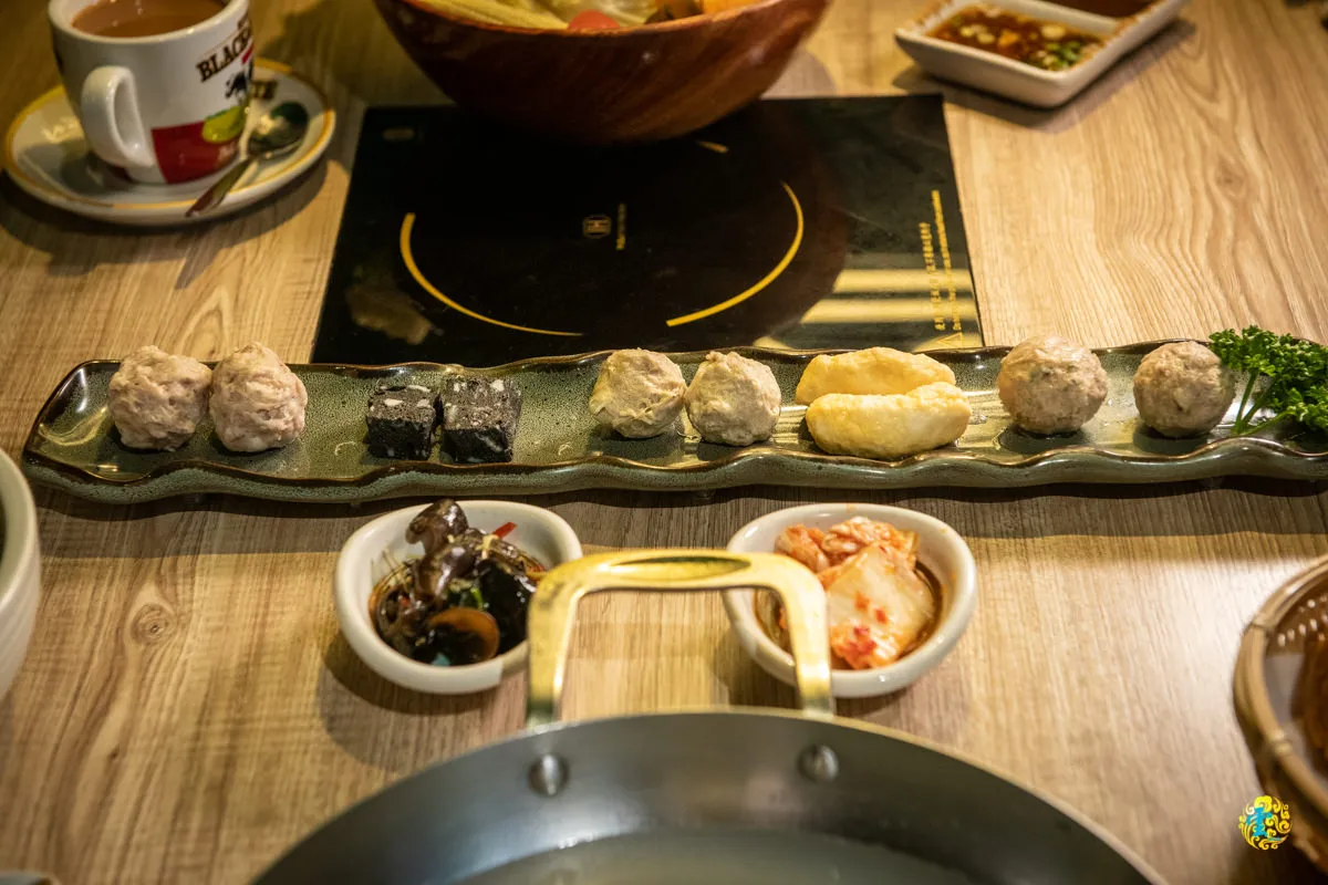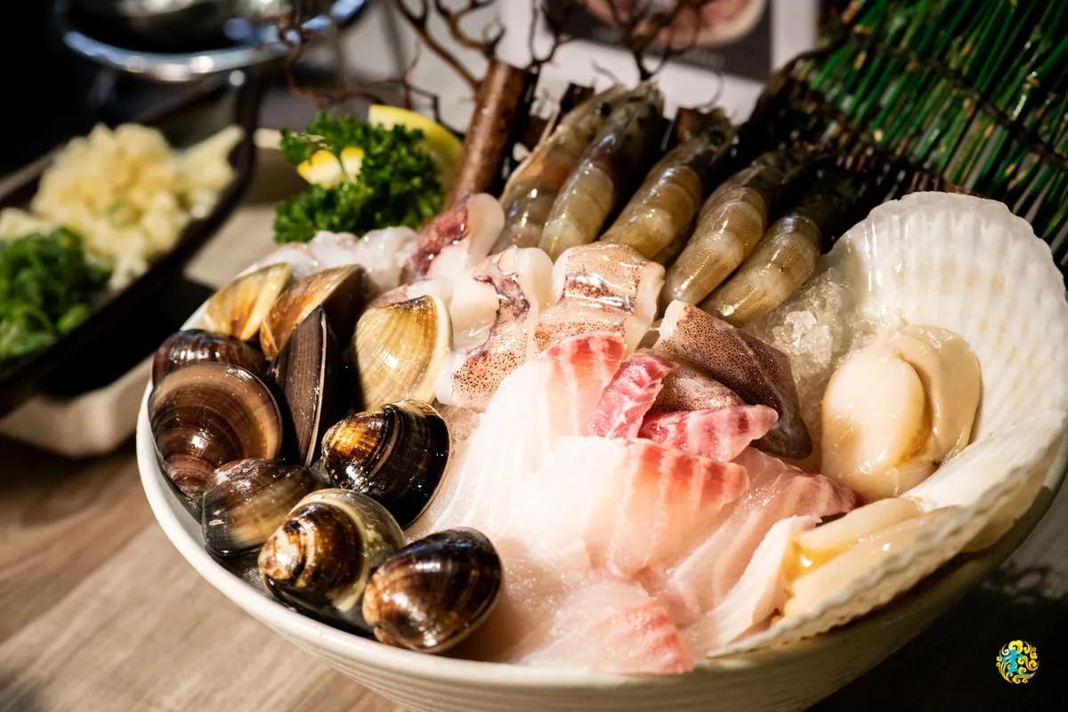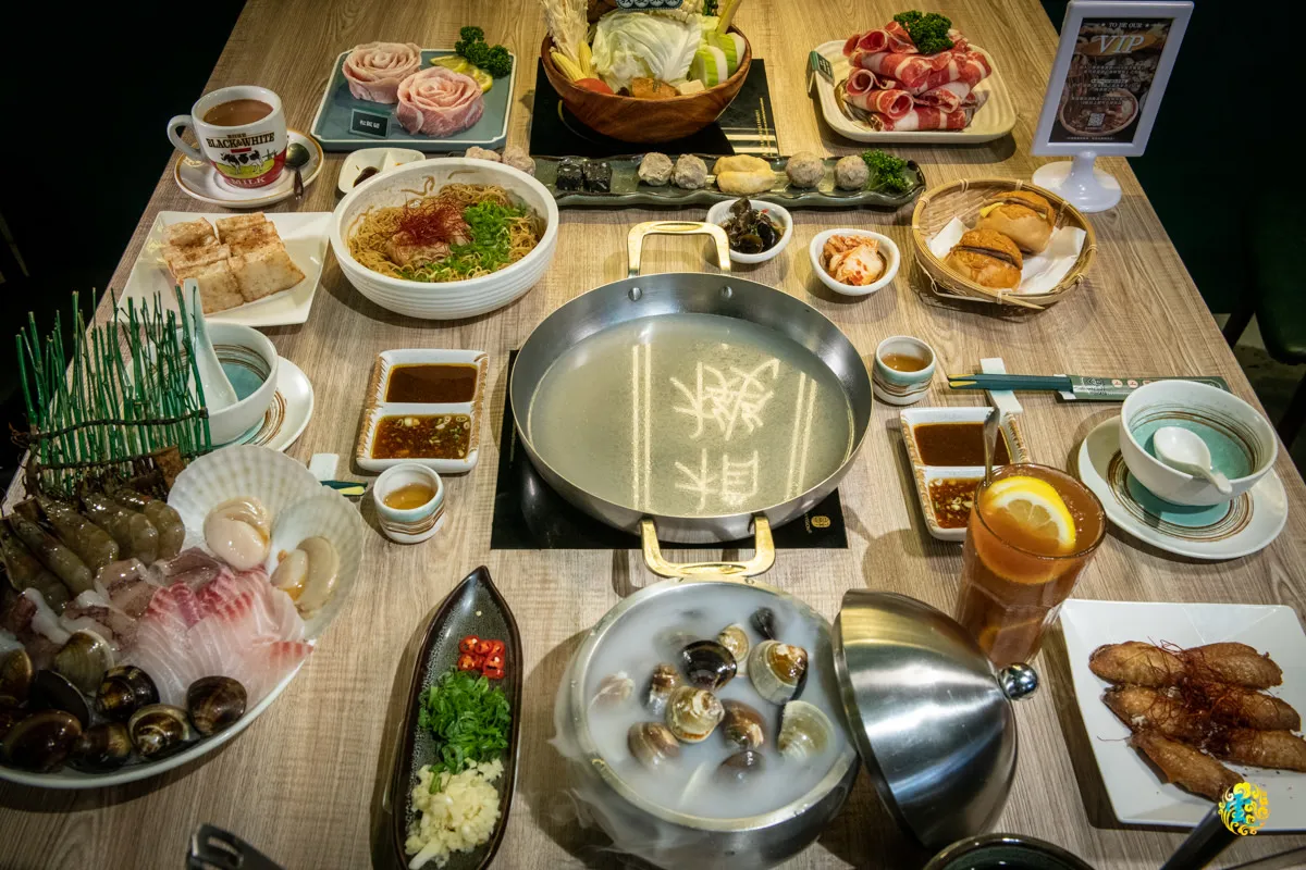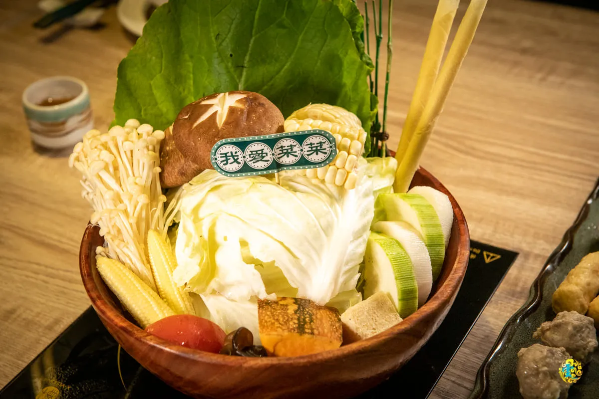 餐點的名稱相當逗趣,菜盤品項依據季節不定期更換,內容物有高麗菜、大香菇、金針菇、水果玉米、南瓜、芋頭、玉米筍、番茄、千張豆腐紙、鵝白菜與各式季節時蔬等多種食材,當中的水果玉米鮮甜多汁讓人記憶猶新,而薄如紙張的千層豆腐紙,夾進鍋裡汆個幾下,淡淡的豆香,如果包著蛤蜊肉一起食用,滋味相當特別說。