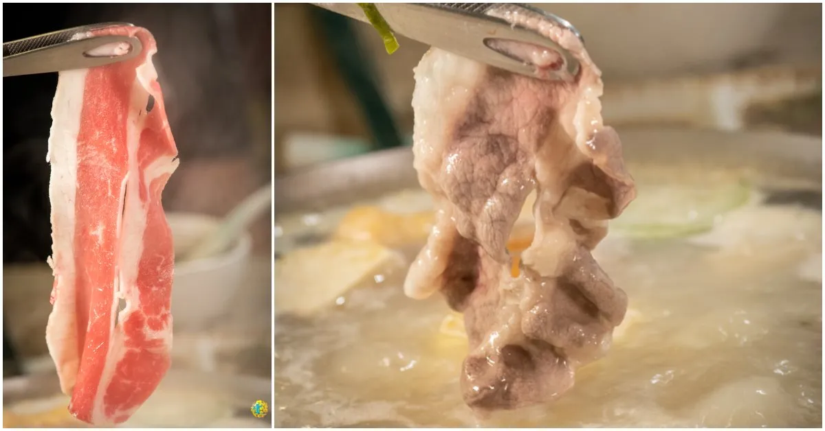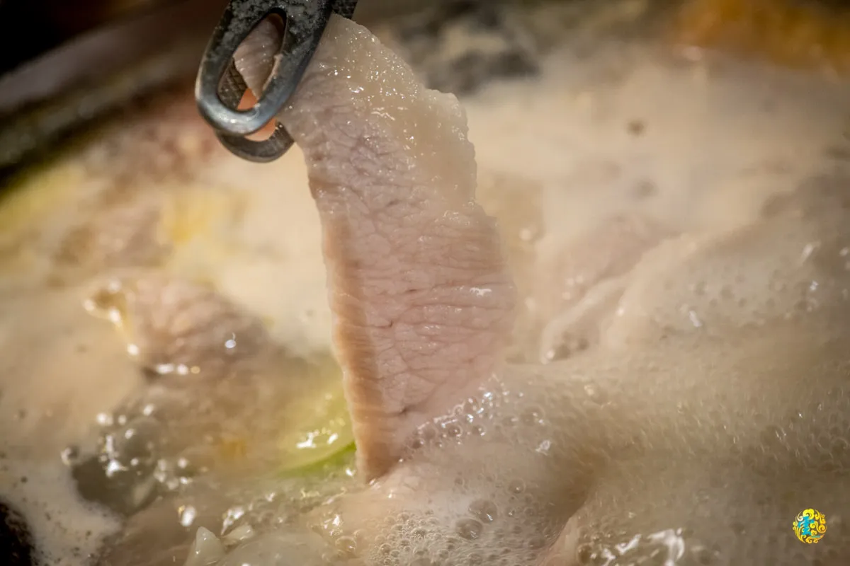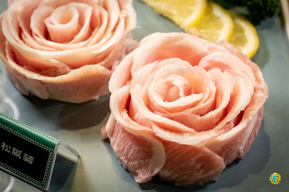 圖|油花分布均勻且肥瘦適中,捲成玫瑰形狀更添視覺感受。 圖|松阪豬汆在蛤蜊湯底中,正是所謂的山珍與海味啊。