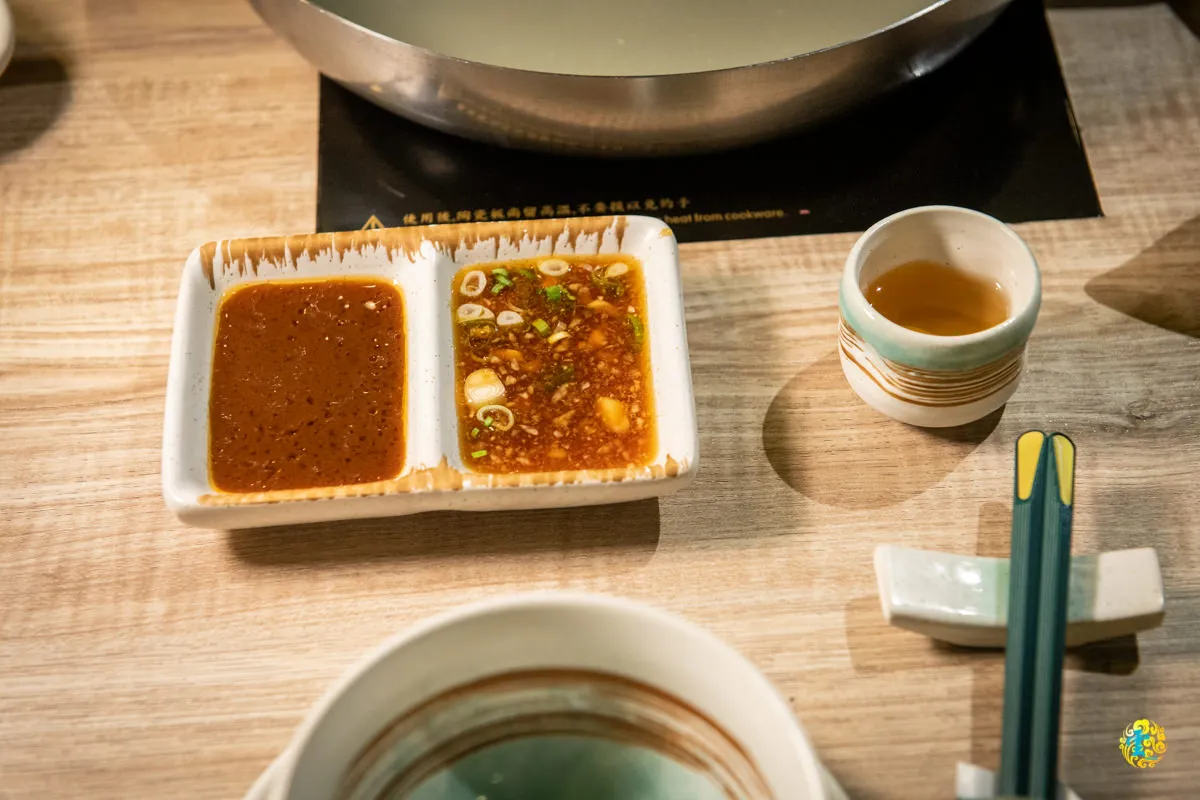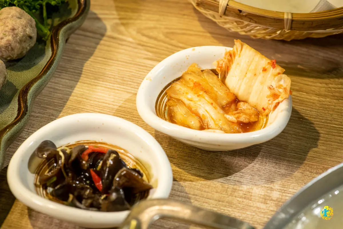 蛤huh pot提供兩種特色沾醬,深色是椒麻醬,有蔥花的是特製水果醬,各自依照需求取用。酸溜的梅子汁,酸甜爽脆的鶯歌泡菜,與厚實爽口的花椒川耳,在湯滾之前可以先墊一下胃,也開胃。