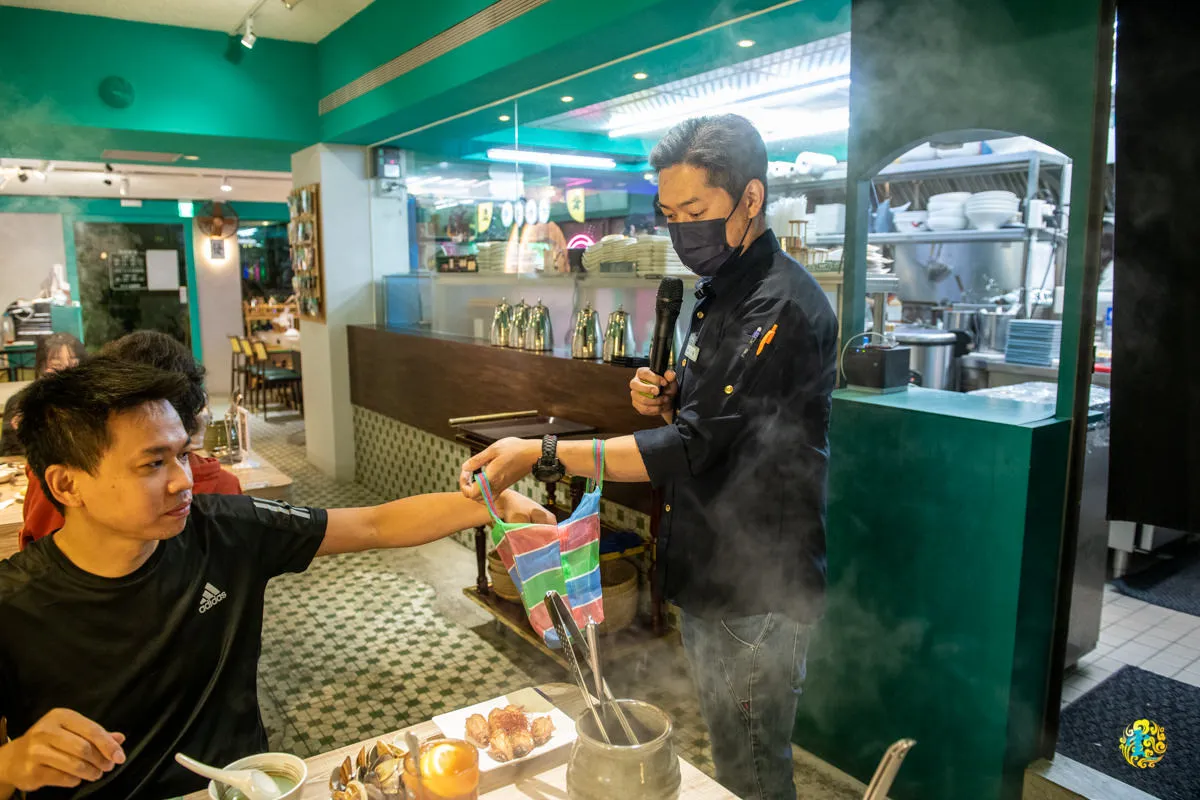 至於為何會有這個遊戲,是因為麻將對於香港人來說是蠻重要的一項娛樂活動,他們連喜宴前都先打麻將之後才用餐,在香港電影中也常見麻將文化,蛤Huh pot就將之帶入品牌元素中。假如有聽牌的話,可以自摸一張牌,如果自摸連線還有額外的獎品喔。不過那晚抽完15張牌都沒有人連線成功,店家很佛心的加碼好幾張,也因為加碼的關係,讓凌雲也成功連成一線~哈。