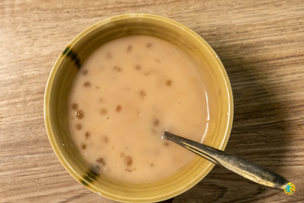 這是熱的甜點,品項每周更換,今天的是芋頭西米露。與泰式西米露不同的地方是沒有添加椰漿,甜品的濃稠度全都來自於芋頭,芋頭加的比較多,透過芋頭的澱粉慢慢熬煮出來的濃稠感,給予濃厚的豐腴滿足。