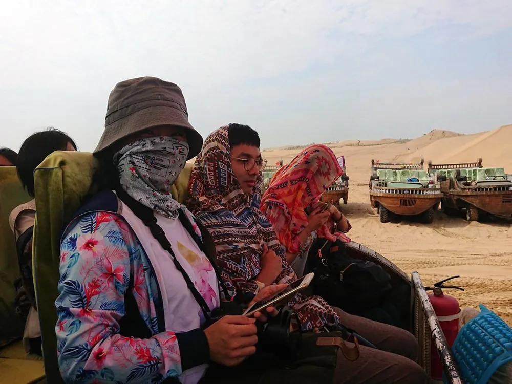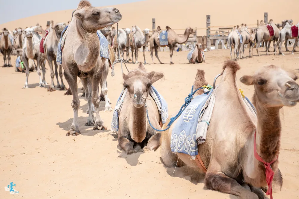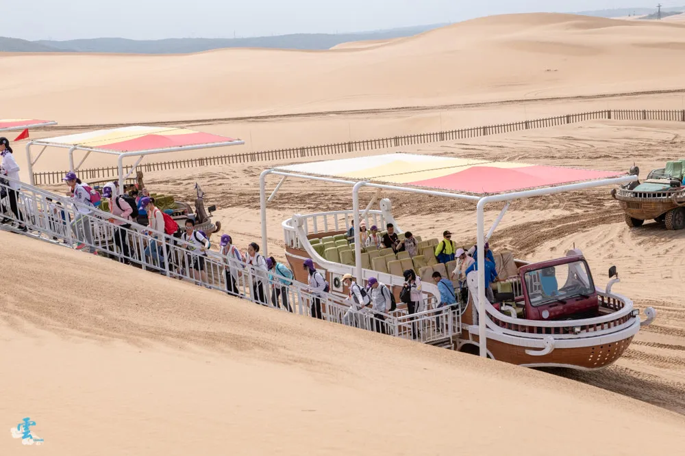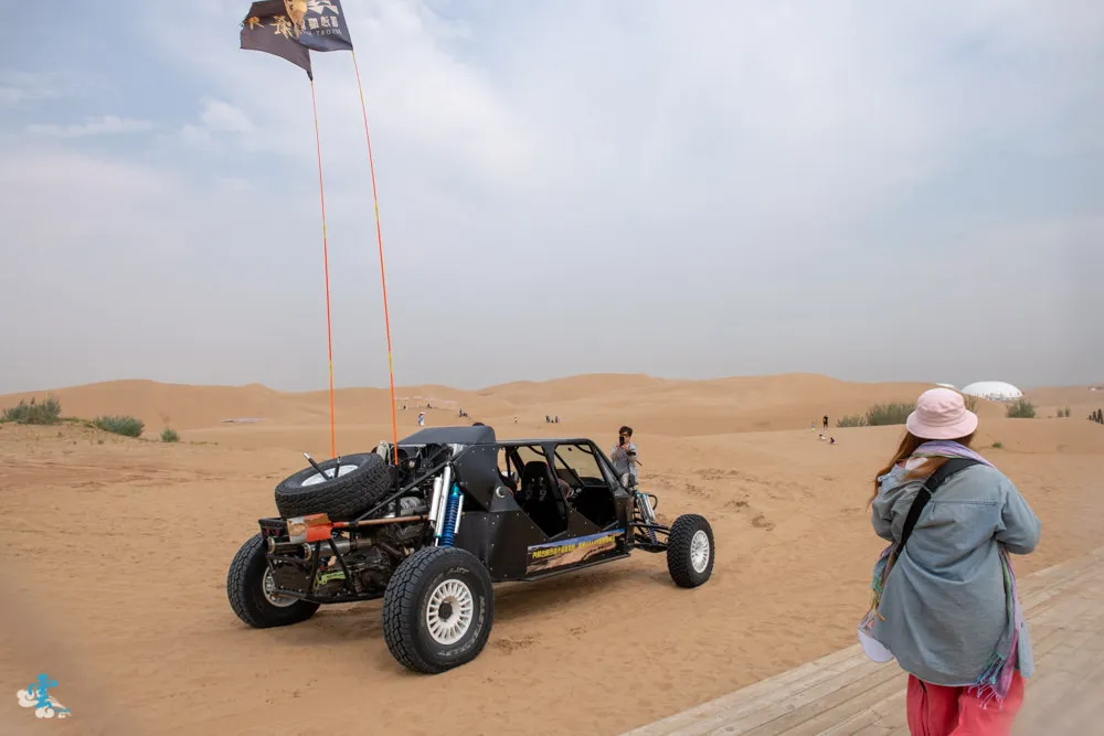 響沙灣遊樂項目非常多,其中非玩不可的就是騎駱駝體驗。駱駝是跪坐在地上,所以很容易就騎上駱駝,但是接著他會先站直後腳,你會以接近70度左右的角度前傾,然後駱駝又提起前腳,所以你馬上又後仰坐正。騎在駱駝上視野還不錯,搖搖擺擺的過程中,有時還會聽到駱駝的口水聲,是個很特別的體驗,你一定要來試試看。來到沙漠中,沙灘車當然也是不能錯過的啊,坐在沙灘車上,看司機無視地形阻礙,穿梭在沙漠之中,感受那種熱血與刺激的快感,雖然不能自己駕駛,但也算是個必推的體驗。