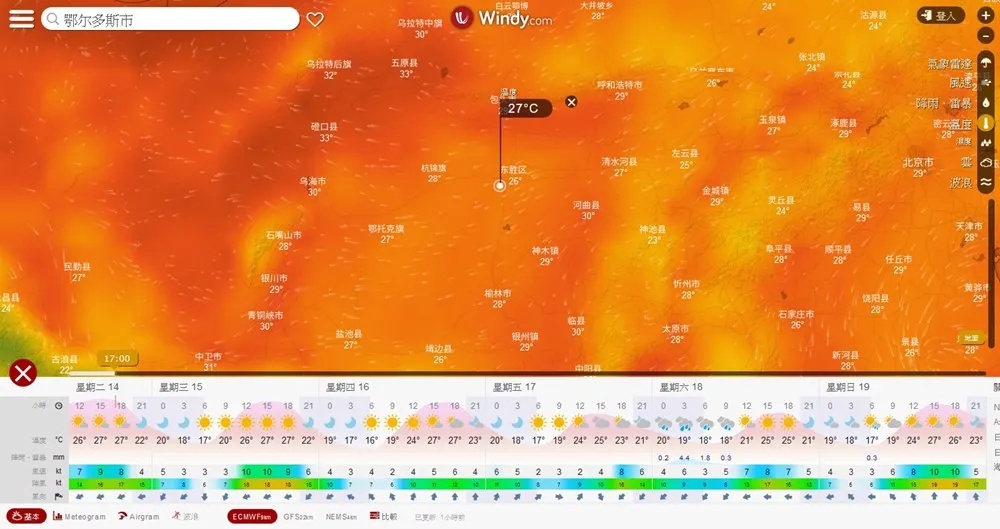 鄂爾多斯氣候乾燥,四季分明,冬季真的很冷(平均溫度為攝氏負28度)。內蒙古最佳的旅遊季節是氣候較為溫和的5-9月,這次我們去的時間是7月中旬,剛好是內蒙古降雨較為集中的時間(7-9月),不過我們此行運氣不錯大都是晴天。內蒙古氣候最大的特點就是早晚溫差甚大,有朋友5月去的時候一直說晚上很冷,所以建議我要帶一件羽絨外套去,我也照辦了,不過此行都沒有用到,7月份白天氣溫大約在攝氏30度上下,晚上則是掉到攝氏15-20度之間,所以早晚加一件薄外套即可。基本上夏季來鄂爾多斯,建議攜帶的物品有太陽眼鏡、遮陽帽、絲巾、口罩/魔術方巾、防曬乳、護唇膏、潤膚乳、雨具、薄外套、水壺或保溫瓶等等。女生只要勤補防曬乳,想穿短褲也可,不過若要體驗騎馬或騎駱駝,建議要著長褲。鞋子則挑好走舒適的就好,短筒佳因為比較不會進沙。因為這裡氣候比較乾燥,要記得隨時補充水分。在此凌雲推薦一套查詢天氣的好用工具-Windy,可以同時顯示最近幾天每隔3小時的氣候參數,資訊正確快速又方便。