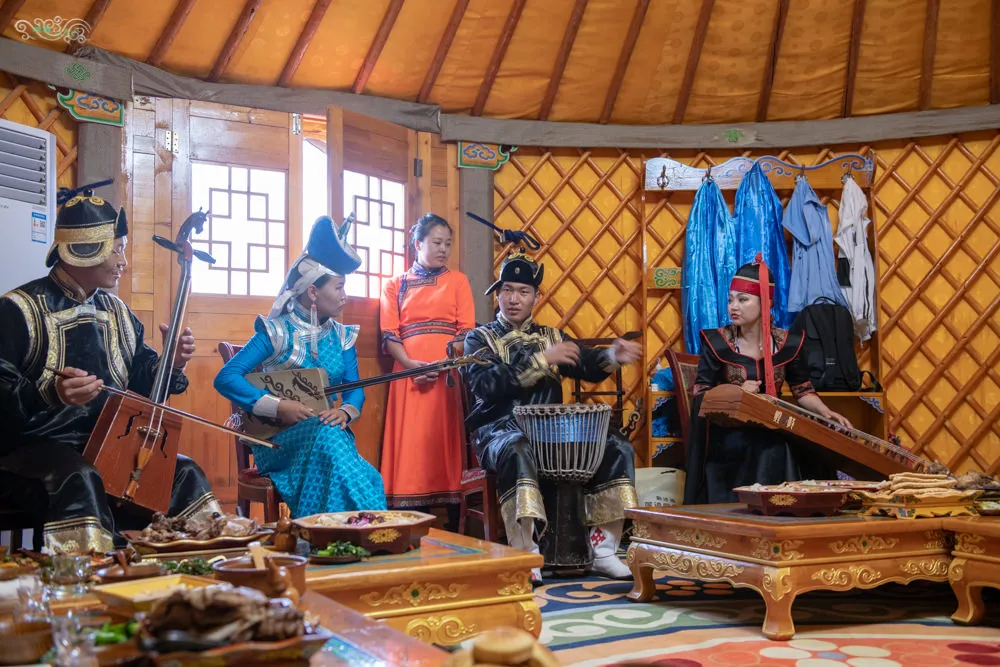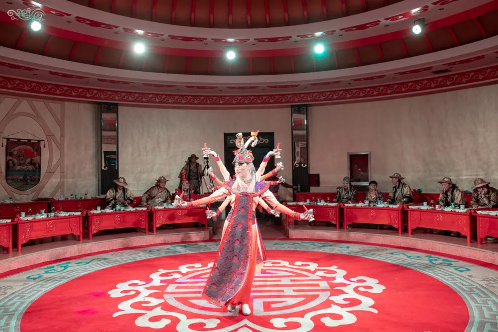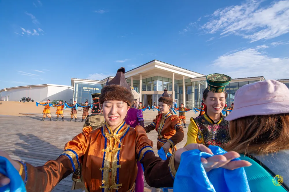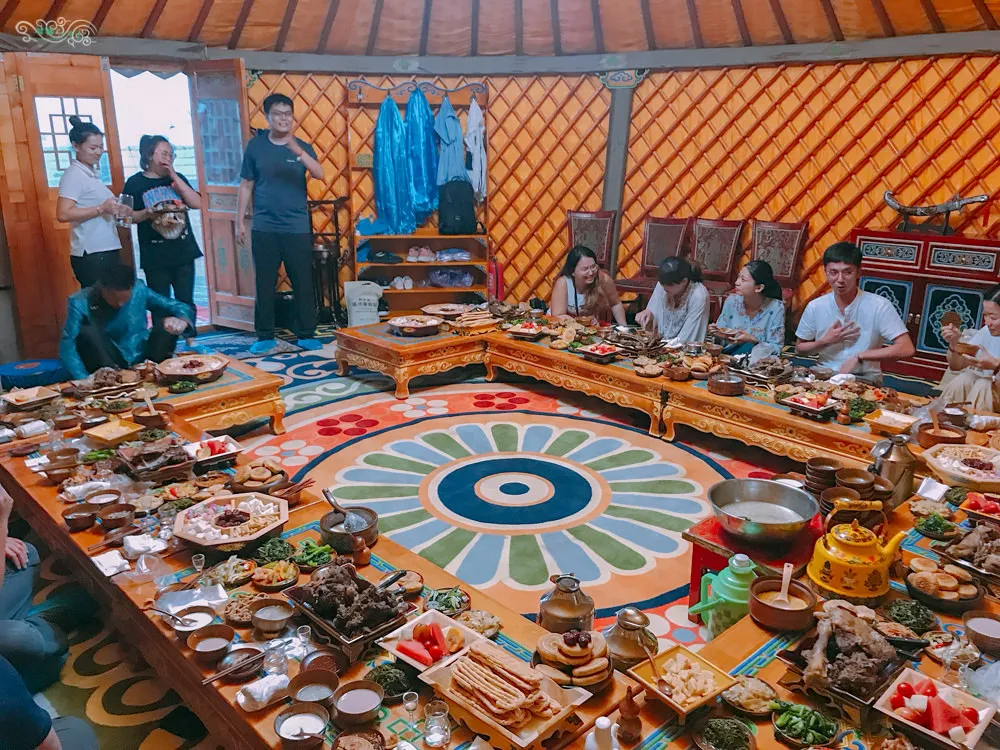 來內蒙古旅遊,住蒙古包已經不稀奇了,在真正的蒙古包內享用傳統的蒙古家宴,那才是最道地的特色體驗。在響沙灣的福沙度假島內,有成群的蒙古包可以讓遊客們體驗蒙古族大口吃肉大碗喝酒的豪邁宴席。每個蒙古包裡都掛有成吉思汗畫像,因為那是蒙古族的最高精神指標。一入座,桌上陸陸續續擺滿了蒙古族傳統的點心、奶茶、小菜、手把肉、烤羊排等道地佳餚,以及絕不能少的蒙古白酒。接著就看到提著蒙古傳統樂器的隊伍進來了,這是蒙古族招待賓客時展現熱情的一種方式,此時主人家開始向諸位賓客敬酒,蒙古族的習俗是【歌聲不斷酒不斷】,在歌舞聲尚未停歇之前,主人家就會一直敬酒,客人如果喝得開心,就表示對主人家的招待很滿意也表示對歌舞表演者的讚美。在蒙古家宴中還可以體驗蒙古族傳統吃法,諸如手把肉的切法、炒米跟原味酸奶的結合、羊肉浸奶茶等等。在這裡真的是,用味蕾去體會遊牧民族的飲食文化,用肝去領悟蒙古族的豪邁熱情,但絕對是不虛此行的。