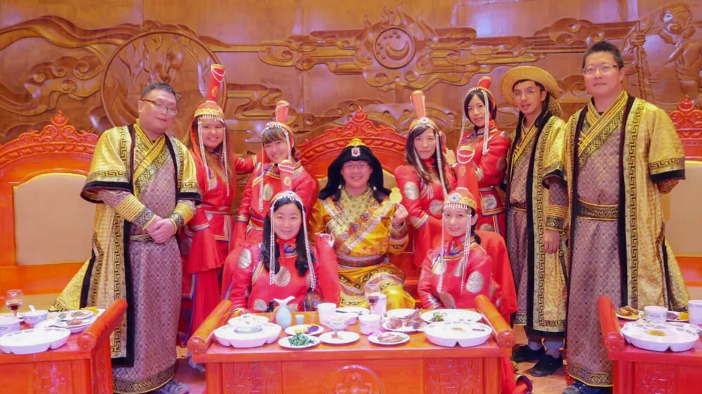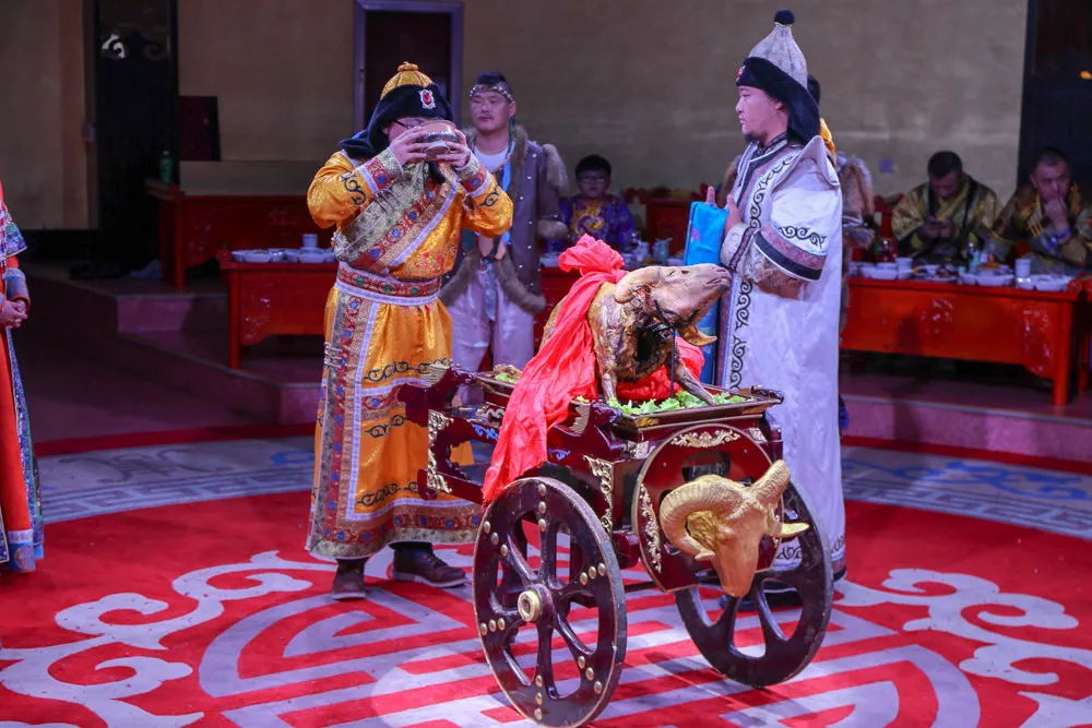 詐馬,蒙古語意是去除毛髮的家畜,詐馬宴是蒙古族特有的慶典饗宴,也可以說是蒙古版的滿漢全席。遊牧民族最主要的肉食就是牛和羊,所以詐馬宴通常會是全牛或全羊餐,目前看到的大多都是烤全羊詐馬宴。詐馬宴是元朝宮廷大宴,結合了宴飲、歌舞與娛樂,對於赴宴者的身分與衣著也都很講究,所以參與詐馬宴的體驗,餐廳都會讓遊客穿著蒙古族宮廷華服,讓你化身大汗、王爺或妃子,實際體驗看看這蒙古第一宴的滋味。詐馬宴都會有一個主持人負責引導整個流程,由扮演大汗的遊客先講一些祝福的話語,便開始了這場難忘的詐馬宴。宴會中不時會有蒙古傳統舞蹈穿插表演,主持人會拿一個小小的羊寶寶玩偶,在賓客間相互傳遞,當主持人喊停的時候,羊寶寶玩偶在誰的手上,誰就得出來表演才藝。直到重頭戲烤全羊現身,主持人會先說些祝福的話語,由扮演大汗的遊客拿刀在羊頭上畫個十字代表吉祥符號,在喝下大碗的蒙古白酒,完成這可汗賜福的儀式,中間省略了很多傳統的儀式步驟,畢竟這只是象徵性的體驗。儀式過後烤全羊會由專門的廚師處理後才送到大家的桌上,蒙古人真的很會料理羊肉,在這吃到的羊肉料理都很美味。只是在大熱天穿著蒙古傳統服飾,真的是很熱啊~
