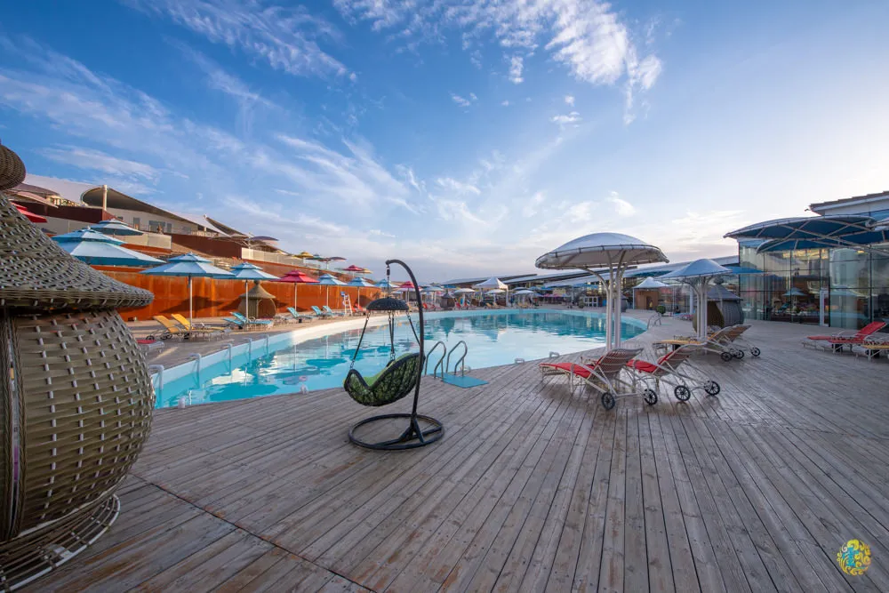內蒙古有四個5A級景區,有兩個在鄂爾多斯,響沙灣是鄂爾多斯兩個5A級景區之一,屬於吃喝玩樂一站全包式沙漠休閒度假區,蓮花度假酒店是響沙灣蓮沙度假島的主體,是由日本建築師與北京設計團隊花了7年的時間精心打造的沙漠休閒酒店,因為考慮到外觀結構、陰影和風力,建築師才將酒店外型設計成蓮花的形狀,全棟建築採環保結構設計,被美國電視新聞網(CNN)列為十八個令人震驚的中國新酒店之一。蓮花酒店採全包式服務,入住時都會在每位房客的手腕上套上一個專屬手環,顏色依據入住的天數而定,入住後飯店內的所有設施、餐飲、娛樂活動與各種表演,憑手環都可以隨你享用玩樂。早餐與晚餐都是採自助吧供應,各類食材一應俱全,晚上的泳池邊還有打水仗遊戲,一旁的活動舞台則是有自由自在匯的雜耍特技與舞蹈表演,表演結束後酒店人員會引導大家到冓火晚會現場,盡情享受熱歌熱舞的暢快。