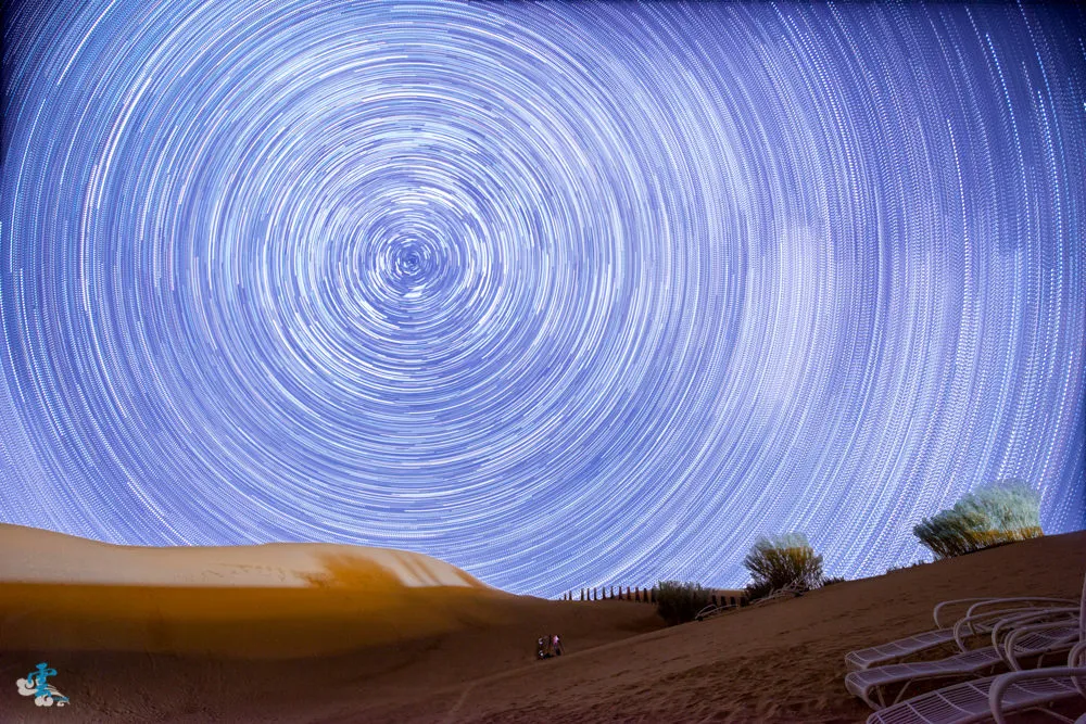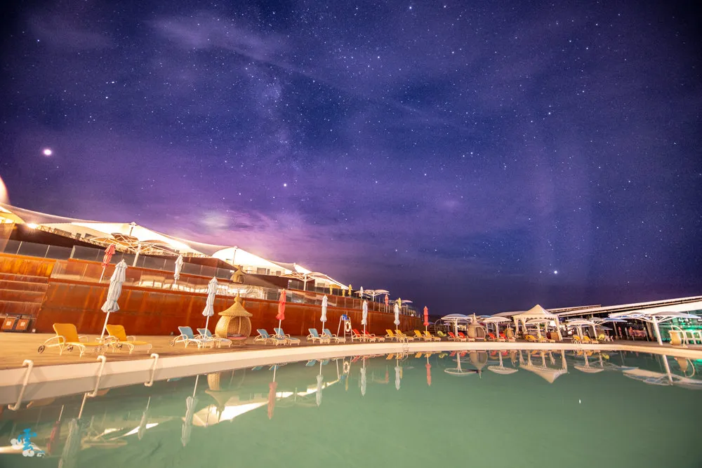 在響沙灣的篝火晚會結束後,在蓮花飯店服務人員的帶領下,我們來到一個沙漠的較低窪處,服務人員會一一解說目前的星空中,有哪些著名的星座與行星,之後就是自由攝影時間,看是要拍銀河或是曝星軌都可以,也因為這裡地勢比較低窪的關係,蓮花酒店造成的光害影響不會太大,坐在沙漠中仰望星空,滿天的耀眼星辰,可以讓煩擾的心靈慢慢的沈澱下來。