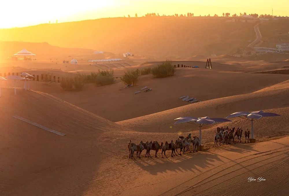 一早的日出,一樣由響沙灣的服務人員帶領前往一個制高點的沙丘,服務人員很貼心的帶駱駝當日出前景。大夥在沙丘上靜靜的等待黎明的到來,當陽光一露臉,瞬間染紅了整個沙漠,美不勝收。