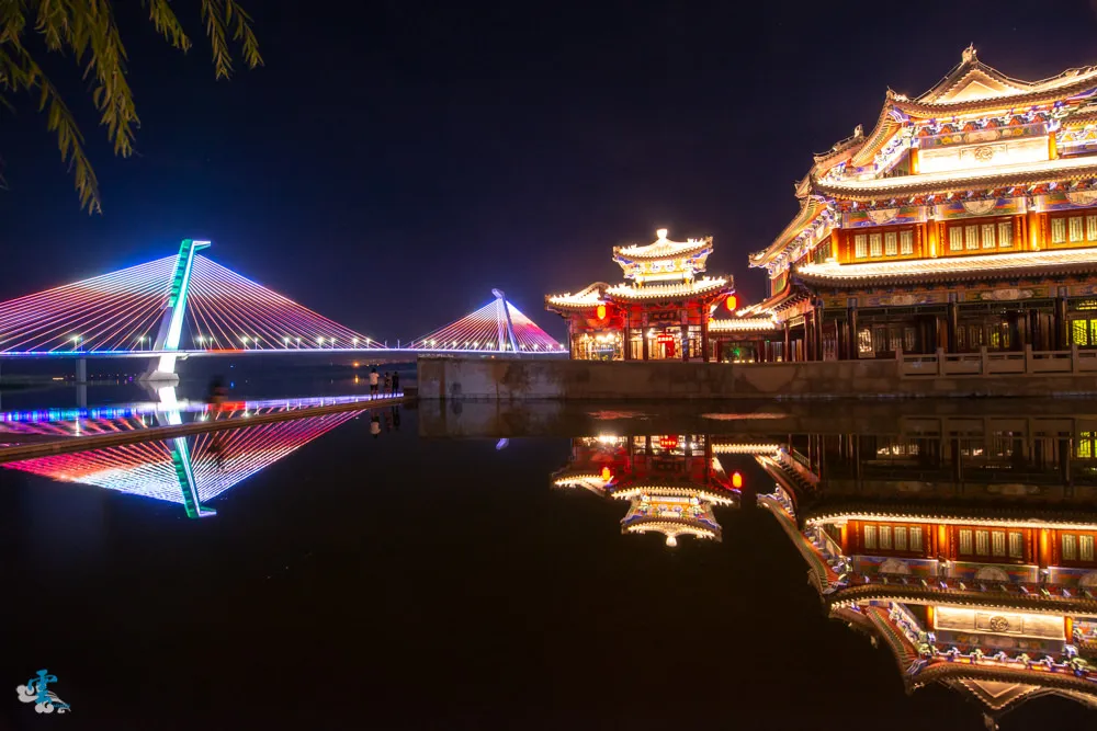 康巴什的夜晚真的是精彩無比,除了之前介紹的康巴什雷射水幕音樂噴泉,烏蘭木倫大橋的夜景也很美麗,他是一條大型的斜拉索橋,夜晚時分透過雷射燈光效果,展現一幅幅絢麗的絢彩畫作,如果到一旁的火宮殿欣賞取景,那古代宮殿與現代橋藝的高度反差,你會發現康巴什就是一個這麼奇妙的地方。