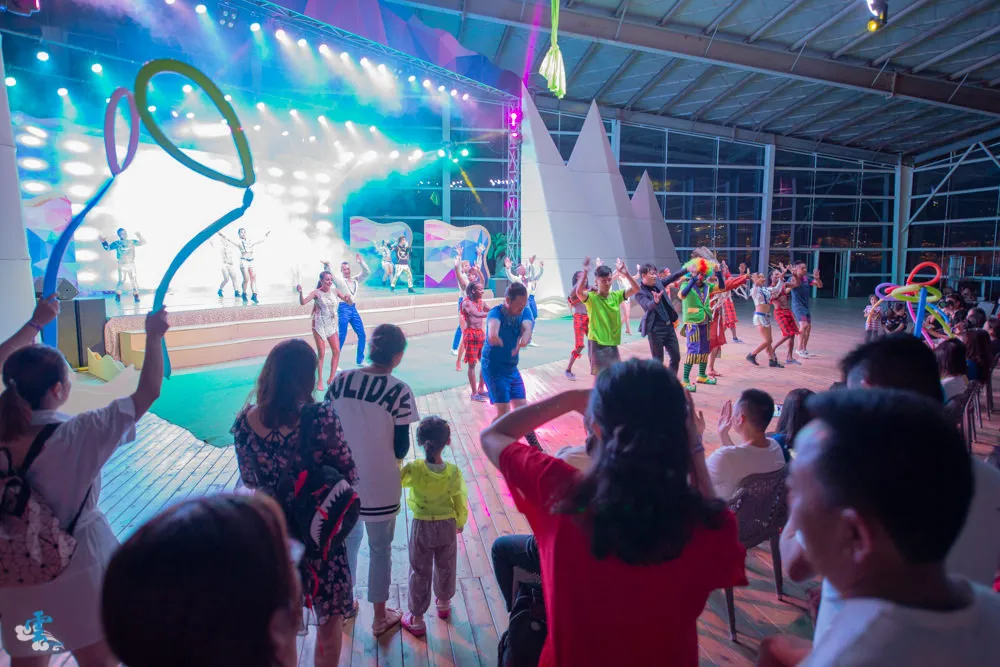 響沙灣自由自在匯表演幾乎每晚都上演,我不確定每晚的表演內容是否都相同,但絕對是精彩可期的,不論是一開始的小丑雜耍互動秀、奇幻舞蹈秀、舞台戲劇表演,到後來的大家一起跳活動,都讓現場所有的來賓不論是大人還是小孩,熱情的一起跟著音樂律動。