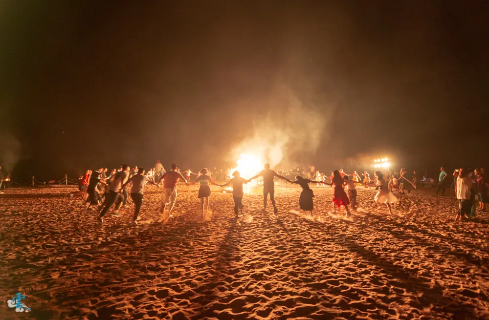 篝火晚會是草原上的一種歡慶儀式,大家一起圍繞著篝火載歌載舞,一旁還有舞者與歌手表演,以及一些即興活動與遊戲。在響沙灣或鄂爾多斯草原渡假區,在夜晚都有這樣的篝火晚會舉行,目的就是讓大家有個愉快的夜晚,也是當地民俗風情的一種體驗。