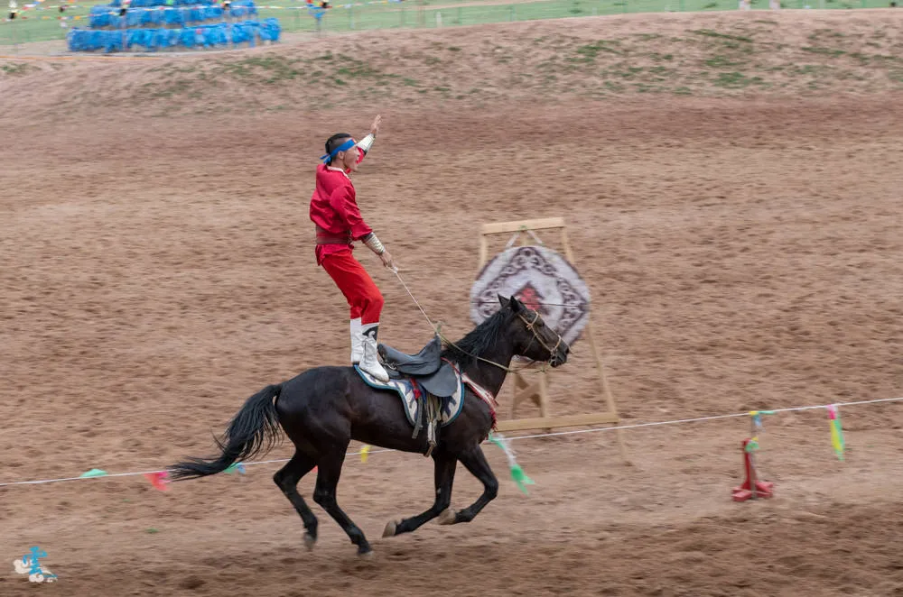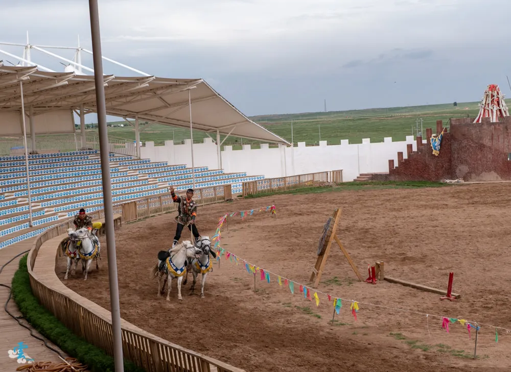 鄂爾多斯草原度假區有精彩的馬術表演,欣賞表演者在馬上翻滾倒立的各種英姿,還有劇情式的射箭與競技表演,最後表演者與馬匹一字排開,提供遊客合照留影,為這精采的表演畫下完美的句點。