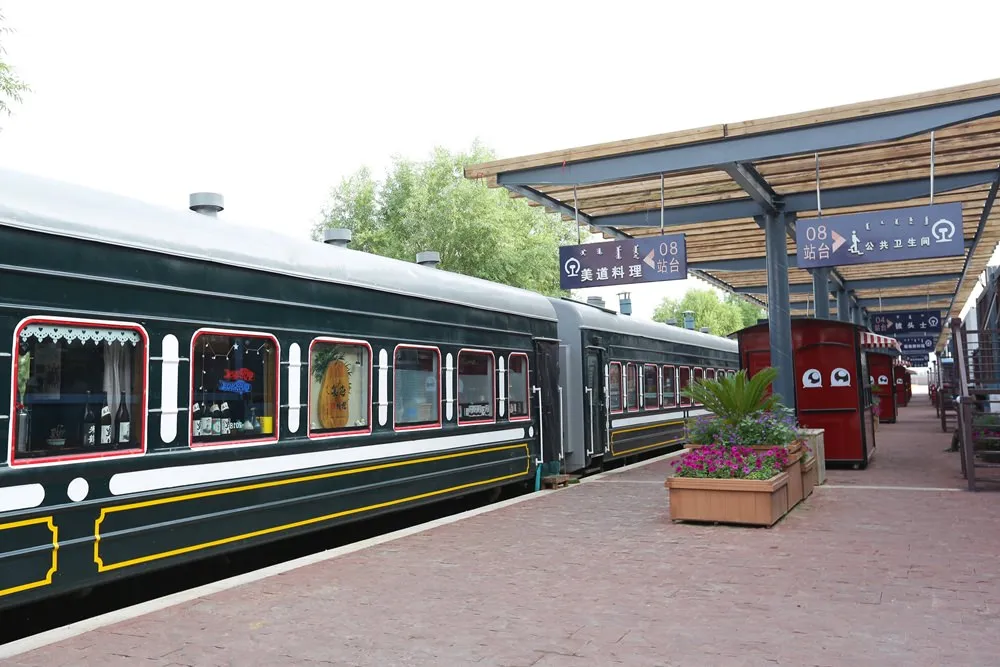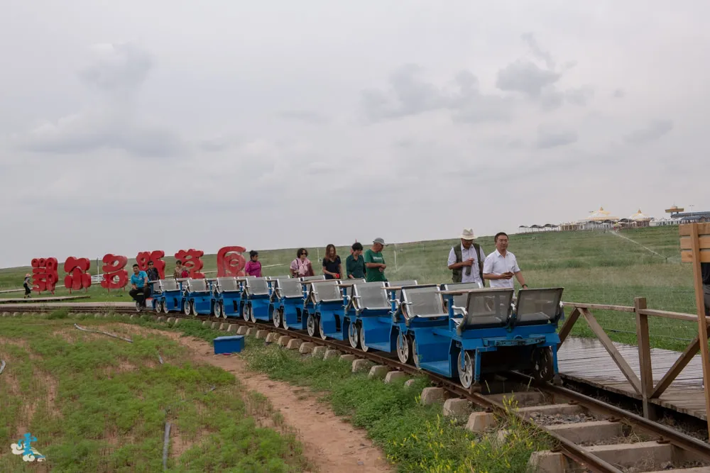 鄂爾多斯草原度假區幅員廣大,從蒙古包住宿區要移動到草原休閒娛樂區,有提供軌道車接送服務,軌道跟剛剛提到的馬道是平行的。