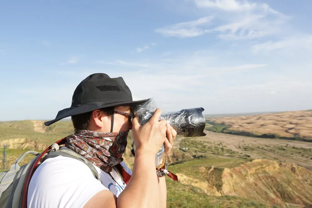 出發前在網路上看別人都說,在沙漠地區拍照要做好保護措施,還有圖解說明如何包保鮮膜,我有照著包好了,不過第一天只拍了一個小時,我就把機身的保鮮膜撕掉了,因為取景跟觀看拍攝結果時都有點麻煩,直到離開沙漠地區,我才把鏡頭上的保鮮膜撕除,同行友人也只有我跟雪倫有包,以個人經驗感覺其實不用包,在沙漠地區就盡量不要更換鏡頭就好,或者用手機拍也可,現在手機的拍照功能日益強大很夠用了。此行為了避免經常更換鏡頭,我是以兩機兩鏡的方式拍攝。