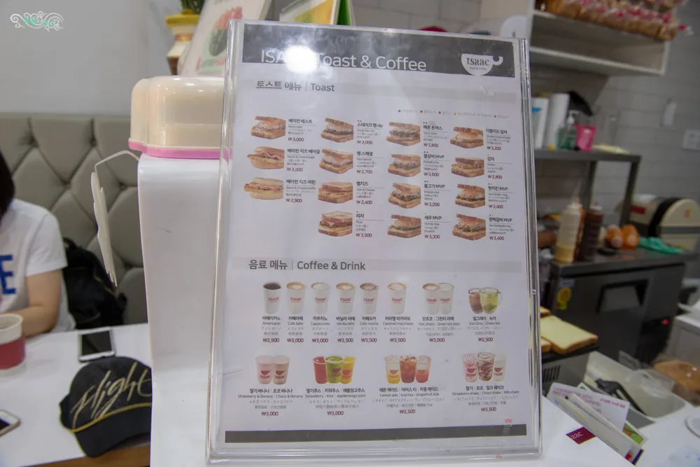 蠻多間ISAAC早餐店都只提供外帶,店內是沒有桌椅的,景福宮附近這間有提供店內用餐空間,每間ISAAC早餐店幾乎都只有兩個店員在服務,一個負責招呼客人,一個負責料理。ISAAC早餐店的菜單,每個品項都有韓文、英文、日文與中文標示,以滿足各種顧客的需求。販售的品項也蠻單純的,除了咖啡、果汁、冰沙跟奶昔類的飲品之外,剩下的就是土司與各種配料的排列組合。價格帶約落在2200~3500韓元不等,幾乎是台灣早餐店的2~2.5倍的價錢了。