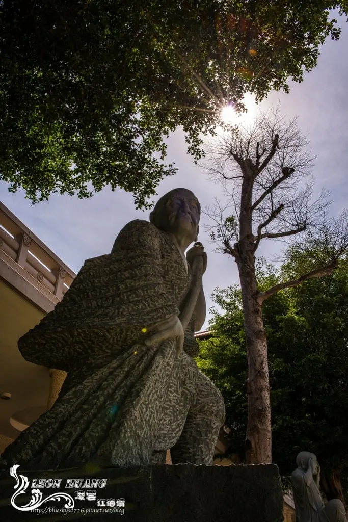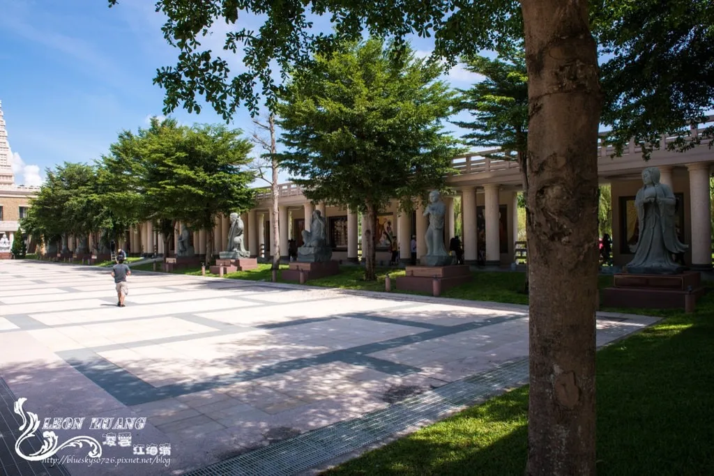 廣場兩側皆種植橄欖仁樹,樹下有十八羅漢尊者像