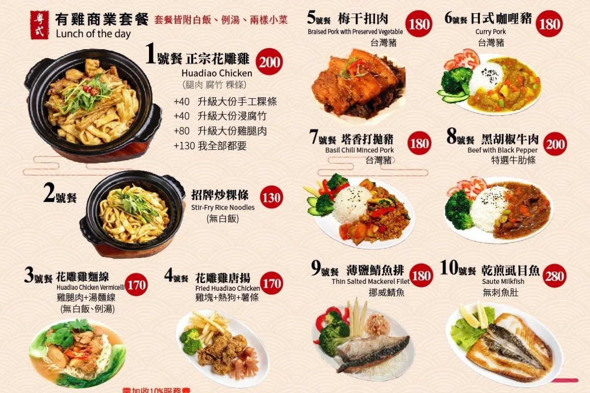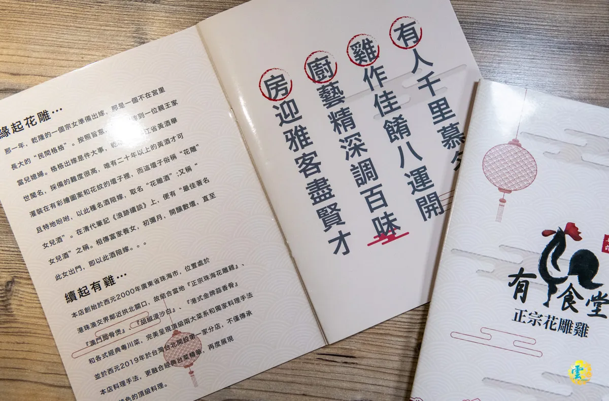 有雞食堂提供一份精美且圖文並茂的菜單,提供視覺和味覺的雙重享受。菜單上有著豐富多樣的菜色,商業套餐多達十種選擇,每一款都伴隨著繽紛的美照,讓人一眼就能感受到這些美味的誘惑。如果是家人或朋友一同用餐,凌雲強烈推薦品嘗粵式正宗花雕雞,這道菜色絕對值得一試,它融合了精選的食材和烹飪技巧,為饕客們呈現出口感嫩滑、香氣濃郁的美味佳餚,再點幾道小菜,就是趟滿足舌尖的味蕾之旅。