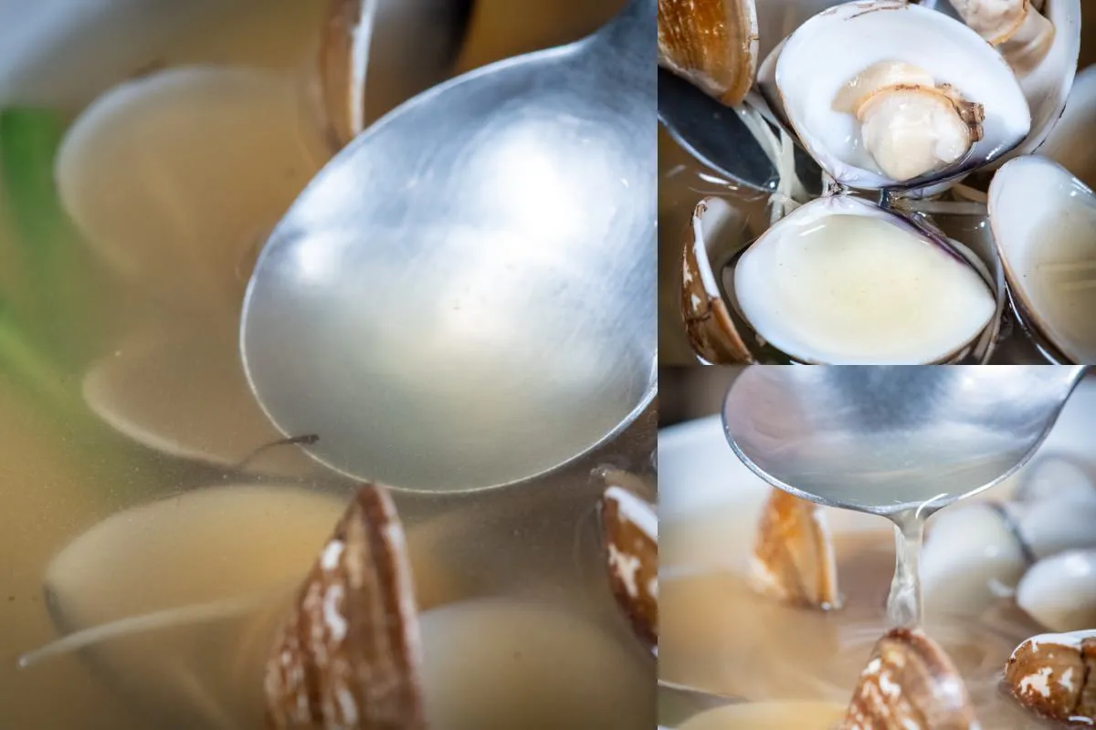 圖|金黃色澤的中藥蛤蜆湯頭,點綴了配菜的紅綠色彩。