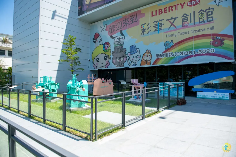 巨大的5支鉛筆超級醒目,另一邊則是巨大的釘書針與釘書針盒,彩色筆盒則當成是彩筆文創館的招牌,將文具結合到地標與招牌是很棒的創意發想。