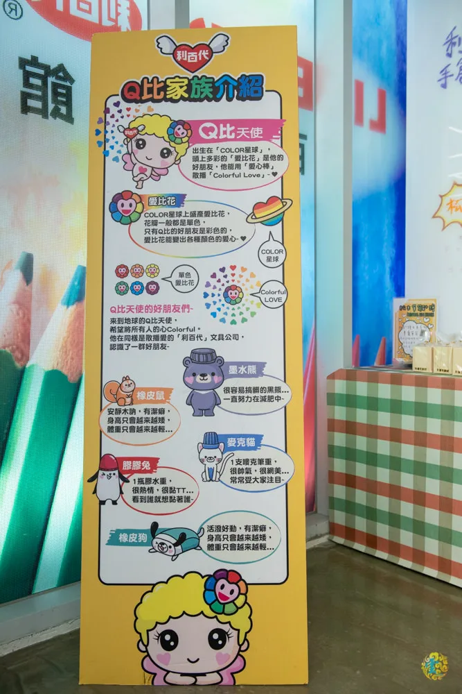 利百代的吉祥物 - Q比家族目前的存在感還有點薄弱,就凌雲觀察小朋友衝上來,除了會在大鉛筆上逗留一下子,繞了一圈後就是在塗鴉牆前畫畫了,中間的一些互動體驗,還需要家長幫忙帶著,小朋友才願意稍微看一下。