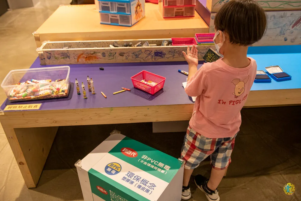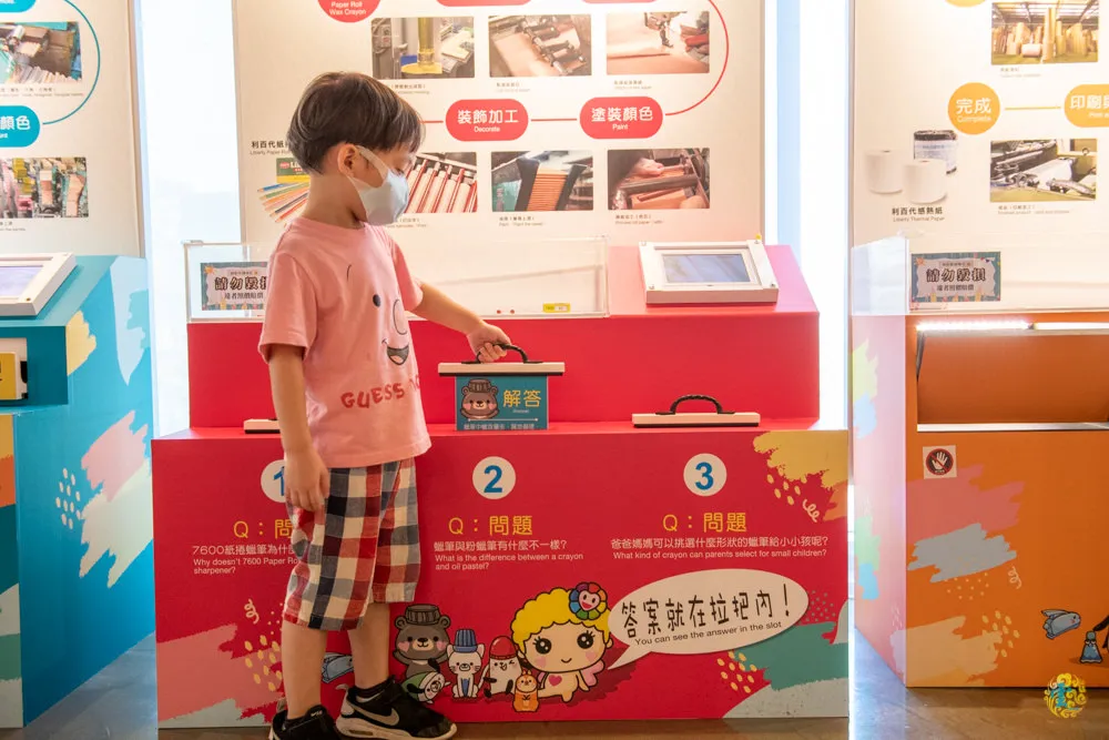 文展區內的互動體驗區,包含印泥、麥克筆、鉛筆、蠟筆與橡皮擦的生產過程,分別由Q比各家族成員把關介紹,由家長帶著孩子一起來體驗,也是很棒的寓教於樂親子時間。