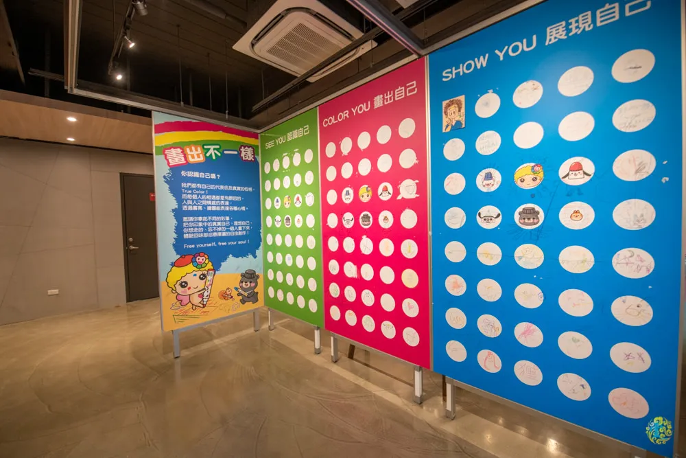 圖|讓你畫出不一樣的自己。 圖|人氣很高的塗鴉牆,每個孩子經過都一定會留下自己的筆跡或畫作。 圖|小凌雲畫到不太想離開說。 圖|現場也有圖像印章與印泥,小凌雲打算直接蓋在手上@@ 圖|親子觀光工廠必備的哺集乳室。