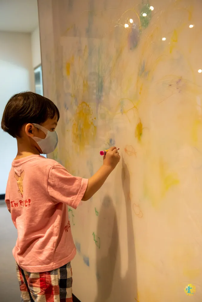 文展區的另一個吸引孩子的地方,就是塗鴉牆啦,這裡有兩面大型塗鴉牆,一面是讓你在小圈圈內畫出自己,一面則是讓你自由發揮隨意塗鴉。很明顯的隨意塗鴉區的人氣比較高,可惜大多的麥克筆都快沒墨水了,畫起來有點淡,不過小朋友們還是畫的很開心。