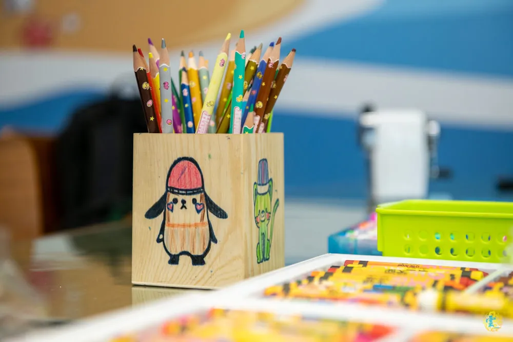 可以使用色鉛筆與蠟筆彩繪,圖案可以自由發揮,如果沒有想法,老師那邊有圖案印章,沾上印泥後蓋在筆筒上,在自行著色即可。