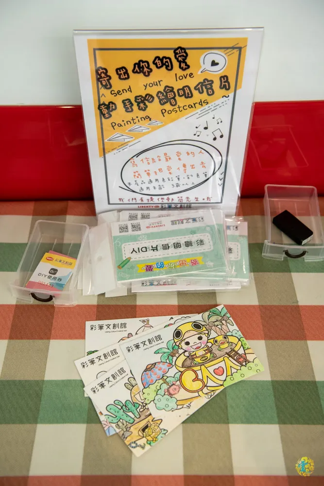 每包明信片都有4張不同的圖案,色鉛筆、蠟筆或彩色筆都可以使用,彩繪完之後可以選擇自己最愛的那張,寫上寄件者與收件者資料後,投入前方的郵筒,利百代會免費郵寄。