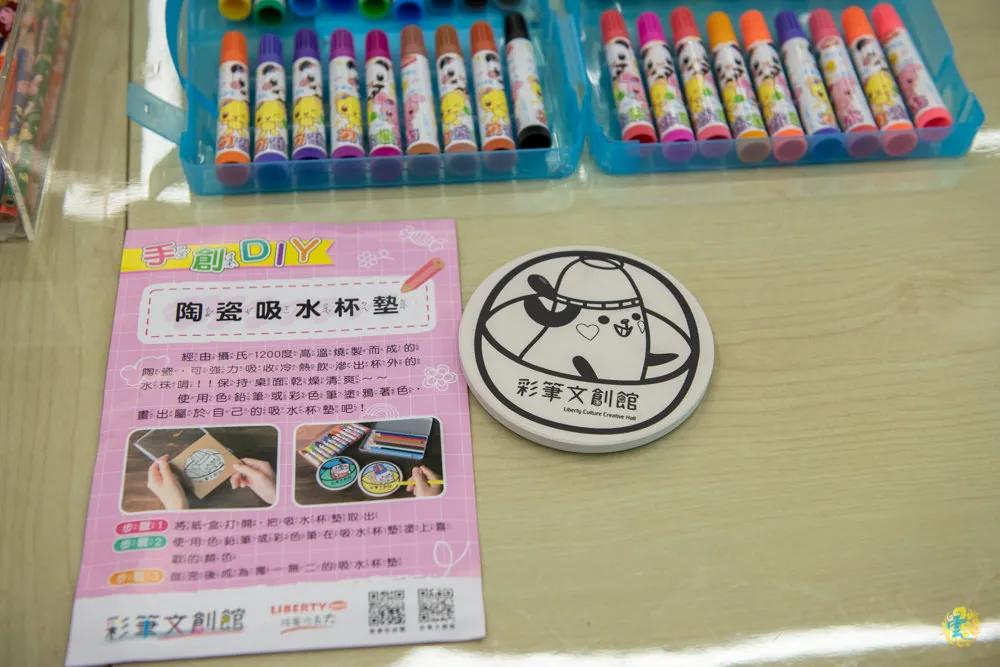 圖|目前提供3種手創DIY選擇。 圖|DIY門票在一樓櫃台購買,一張$150。 圖|這堂課正式開始時是客滿的說。 圖|每張桌上都提供充足的彩色筆、色鉛筆與蠟筆。