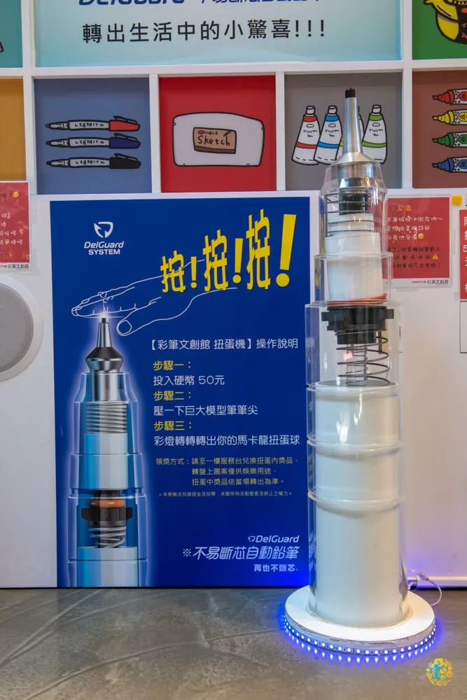 在一樓往二樓的樓梯前方休息區,有一台大型的轉盤扭蛋機,他的啟動器是一個巨大的模型筆,也因此吸引了眾多小朋友的目光,就算沒有要投錢玩扭蛋機,也一定要來按一下筆頭,小凌雲就是這樣,還一直盧女王說要玩。