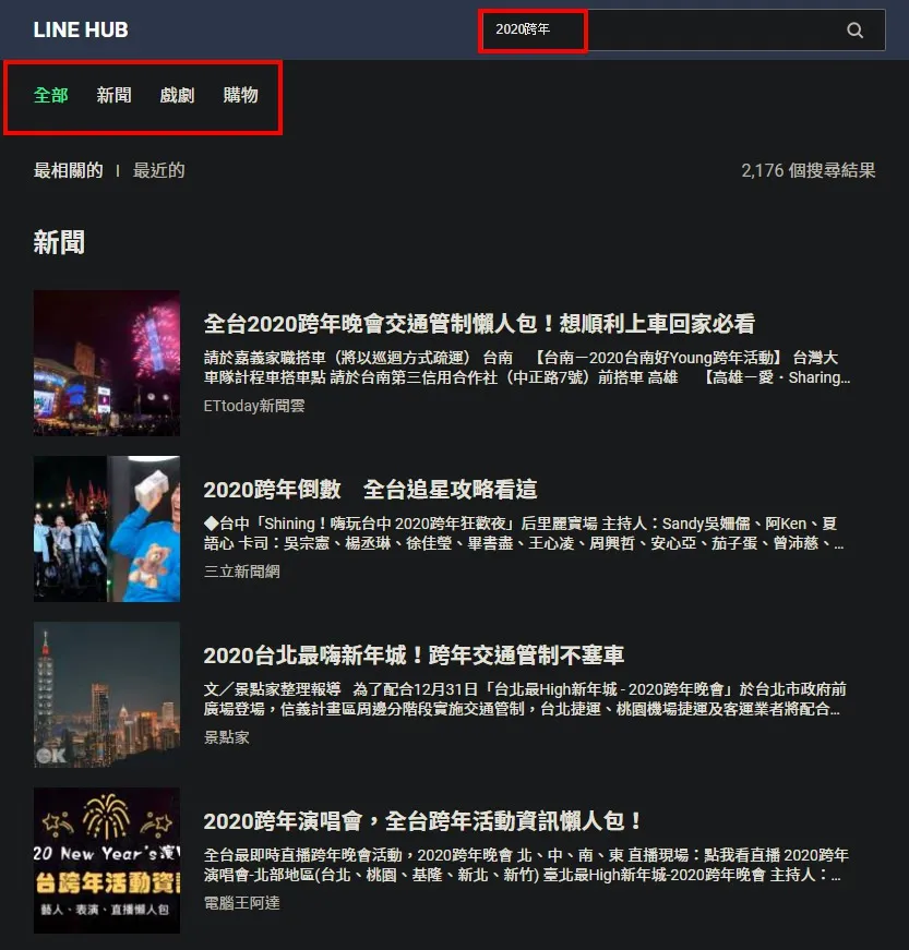 LINE HUB新增搜尋功能,透過搜尋就能輕鬆瀏覽LINE各式服務逐漸累積的豐富內容。凌雲以『2020跨年』來做搜尋,搜尋結果會有三種分類:新聞、戲劇與購物,新聞類的搜尋結果大多是2020跨年懶人包攻略,購物類則是有跨年字樣的商品,戲劇類則沒有跨年相關結果,以搜尋結果來說,有達到凌雲所預期,以2020跨年來搜尋就是想知道有那些跨年活動,LINE 搜尋給了很多實用的跨年懶人包。