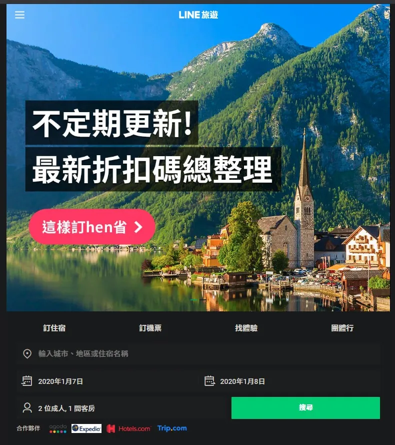 LINE共推出16種相關服務,種類相當多元,是LINE團隊精選透過網頁瀏覽體驗優秀的服務內容。凌雲最感興趣的是旅遊這項服務,LINE團隊不定期更新折扣碼的總整理,這點相當吸引人,如果已有旅遊計畫,輸入目的地與預計入住的日期,會有相當多的住宿推薦與比價結果,此類的合作夥伴也都相當知名,有agoda、Expedia、Hotels.com與Trip.com。