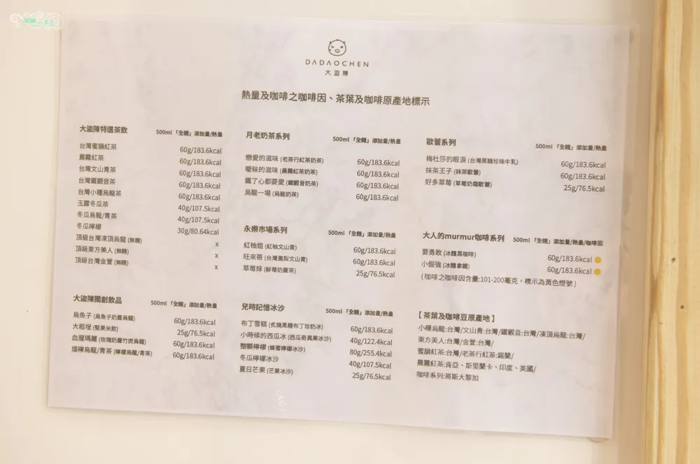 櫃台的上方有碩大的螢幕顯示大盜陳茶飲的詳細菜單,櫃台旁有一張,除了月老奶茶系列,特色與獨創茶飲也是高人氣商品,還有黑糖珍珠、布丁、芋頭等等配料可以依照喜好添加。點餐櫃檯邊的螢幕直接顯示你選購的品項,一目了然,方便顧客確認品項。詳細與最新的菜單請見大盜陳茶飲臉書粉絲頁,有配合外送平台UBER eats跟 foodpanda喔。