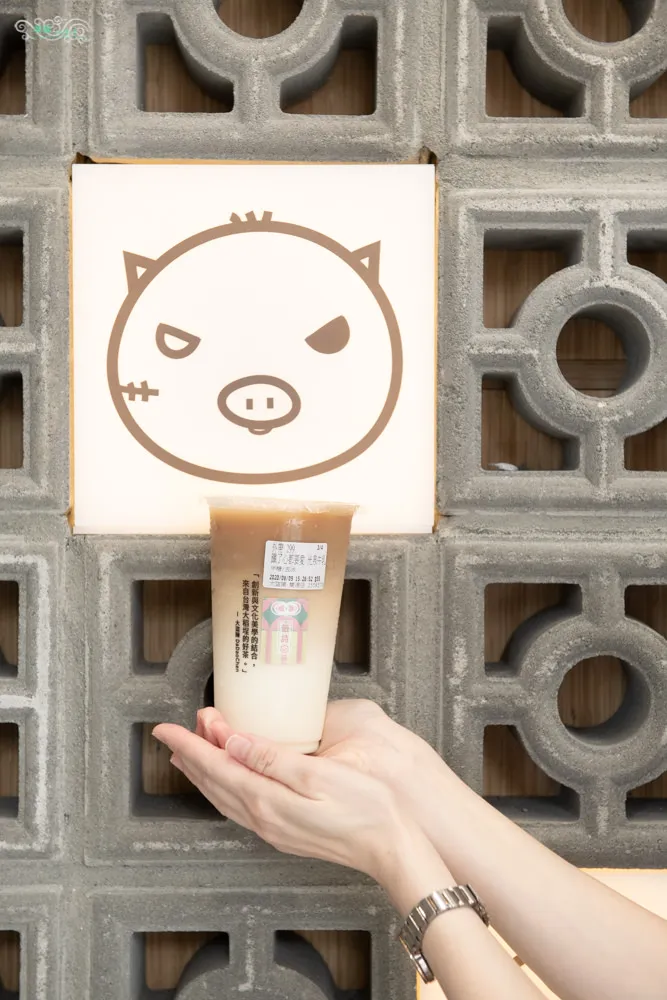 大盜陳茶飲雙連店就在台北捷運雙連站1號出口旁邊而已,交通很方便。獨特、灰階、粗獷的水泥裸牆,呈現略微冷冽的質感,搭配大量溫潤的木材與暖色調燈光,帶來舒適溫暖的視覺安全感,牆面上的俏皮豬圖案,強化了視覺亮點,店面的整體設計相當和諧又完整。